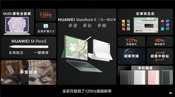 全系12.6英寸120Hz OLED屏幕,屏占比90%,覆盖P3广色域,专业级高色准,600尼特亮度,莱茵全局护眼3.0,前800万、后1300万双摄像头,辅以HUAWEI Sound全栈解决方案等。