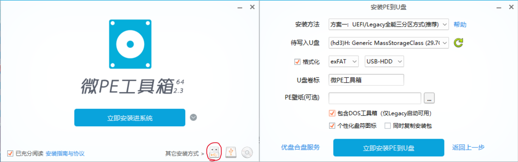 打開下載好的微PE工具箱,點擊其他安裝方式我畫圈的地方安裝到U盤,然後按我如圖勾選的設置安裝就行了,之後我們就會得到一個微PE工具箱盤符,有可能會同時得到一個一個叫EFI的盤符,也可能會自動隱藏,我的就自動隱藏了。再次提醒,製作PE時會格式化U盤,注意保存重要文件。