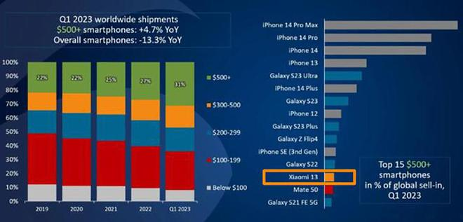 此前的一份數據顯示,在2023年第一季度智能手機單品銷量排行榜上,小米13擠進了前15名,排名比華爲Mate50還要高,“米衝高”取得了關鍵性的勝利。將於11月發佈的小米14,有望幫助小米再創新高。