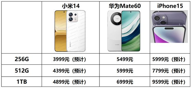 今年內存越來越便宜,小米14當然也會砍掉8+128G和8+256G,直接12+256G起步,售價可能還是3999元起,頂配1TB儲存版本的價格也不會太高。Mate60的12+256G價格爲5499元,預計比小米14貴1500元。iPhone15就算256G儲存起步,也要5999元,預計比小米14貴2000元。