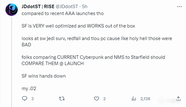 跟最近的3A遊戲比較,《星空》確實得到了很好的優化,看看最近的《星球大戰絕地倖存者》、《紅霞島》、《最後生還者》pc版,那些纔是真的糟糕透頂。那些拿《賽博朋克》、《無人深空》和《星空》對比的人,應該對比這些遊戲。