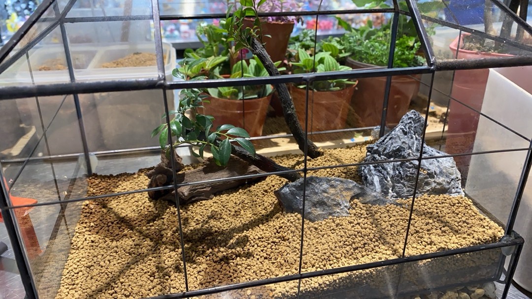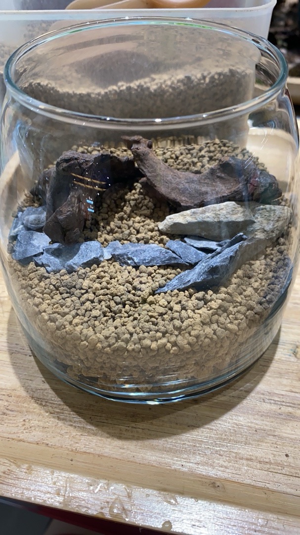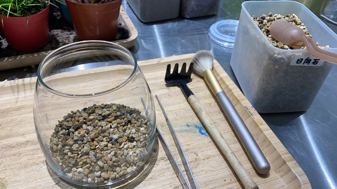 第四步:我們在這一步就可以選擇先將想擺放的擺件(這裏指石頭、木頭等造景,如要選擇放盲盒之類的請放到最後再放入)放入了。別隻放在表面,需做一定固定(旁邊放點土壓實或是使用熱熔膠稍作固定,個人推薦只要往土裏插一點就好。)