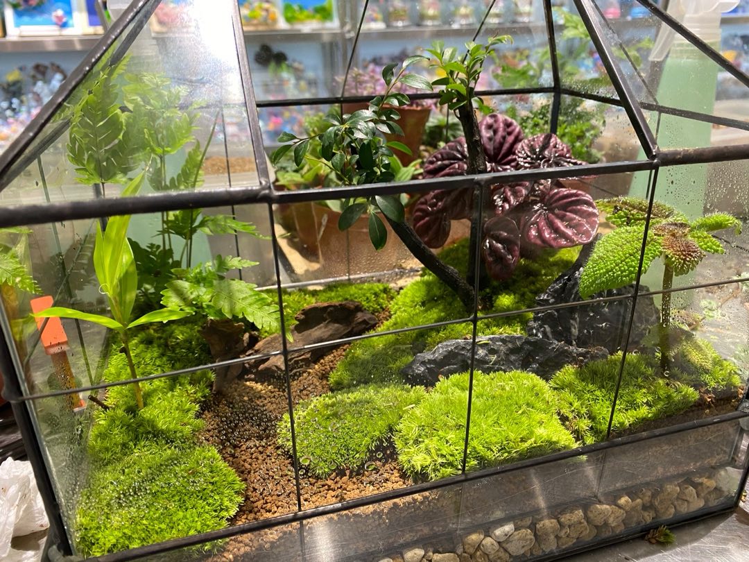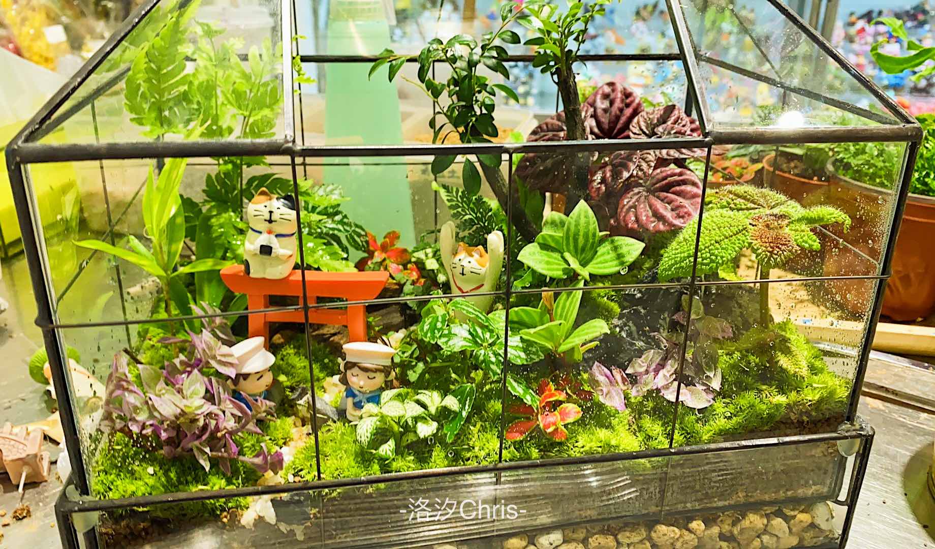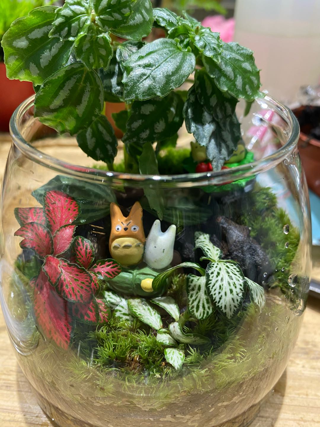 最後:這時候獨屬於你的景觀瓶已經基本完成了!最後就稍微調整下造型,確認下是否有歪斜未進入土裏的植物就好了。完成後擺入想加入的小擺件、玩偶,噴點水在上面就可以拍照留念了哦