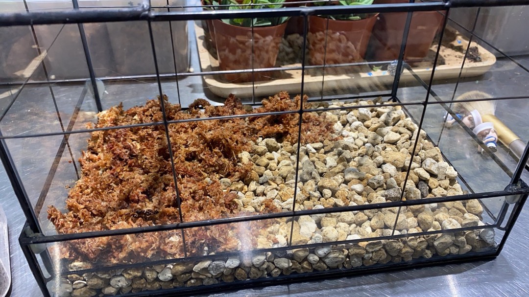 第二步:在瓶中放入一層水苔蘚、水藻啥的。很薄一層即可,但要全部鋪滿底部。(大箱限定,小瓶的話可以省略此步驟)(這是用來一定程度上分隔土壤和吸附水份的)