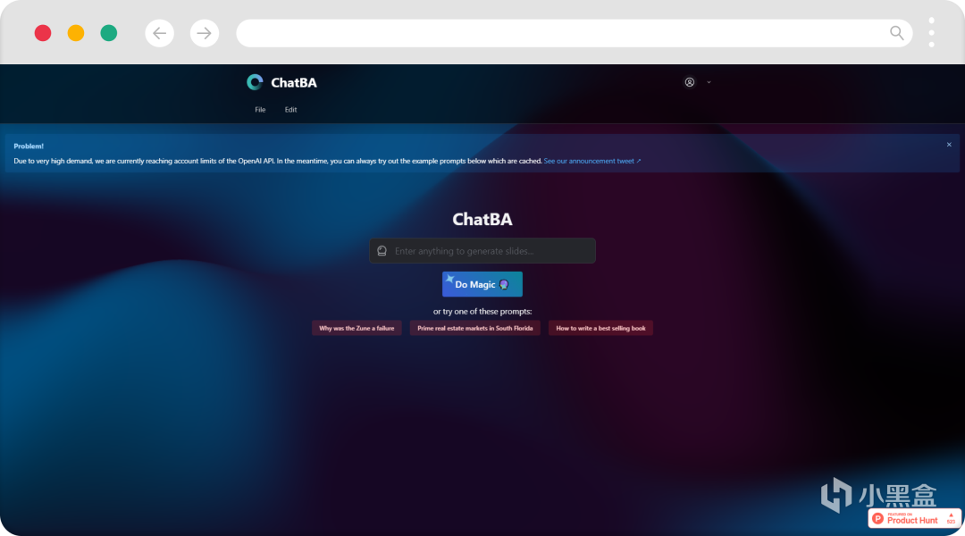 ChatBA 是一个使用生成性人工智能技术创建幻灯片的在线工具。它可以让您快速生成整个 PPT 演示文稿,只需输入一个主题或一些文本,ChatBA 就可以使用 AI 算法生成高质量的 PPT 。不过,由于需求量非常大,目前ChatBA受到了 OpenAI API 的帐户限制。