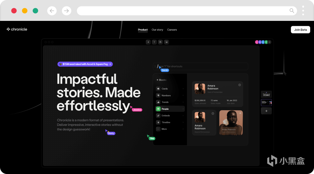 Chronicle 是一个由 AI 驱动的演示文稿应用,它提供了一种新的、简单的创建方式——块。在 Chronicle 中,一切都是用块来制作的,这些块具有像素完美的设计、交互性和运动。无需从头开始设计,只需从块库中选择合适的块,就可以看到魔法般的效果。