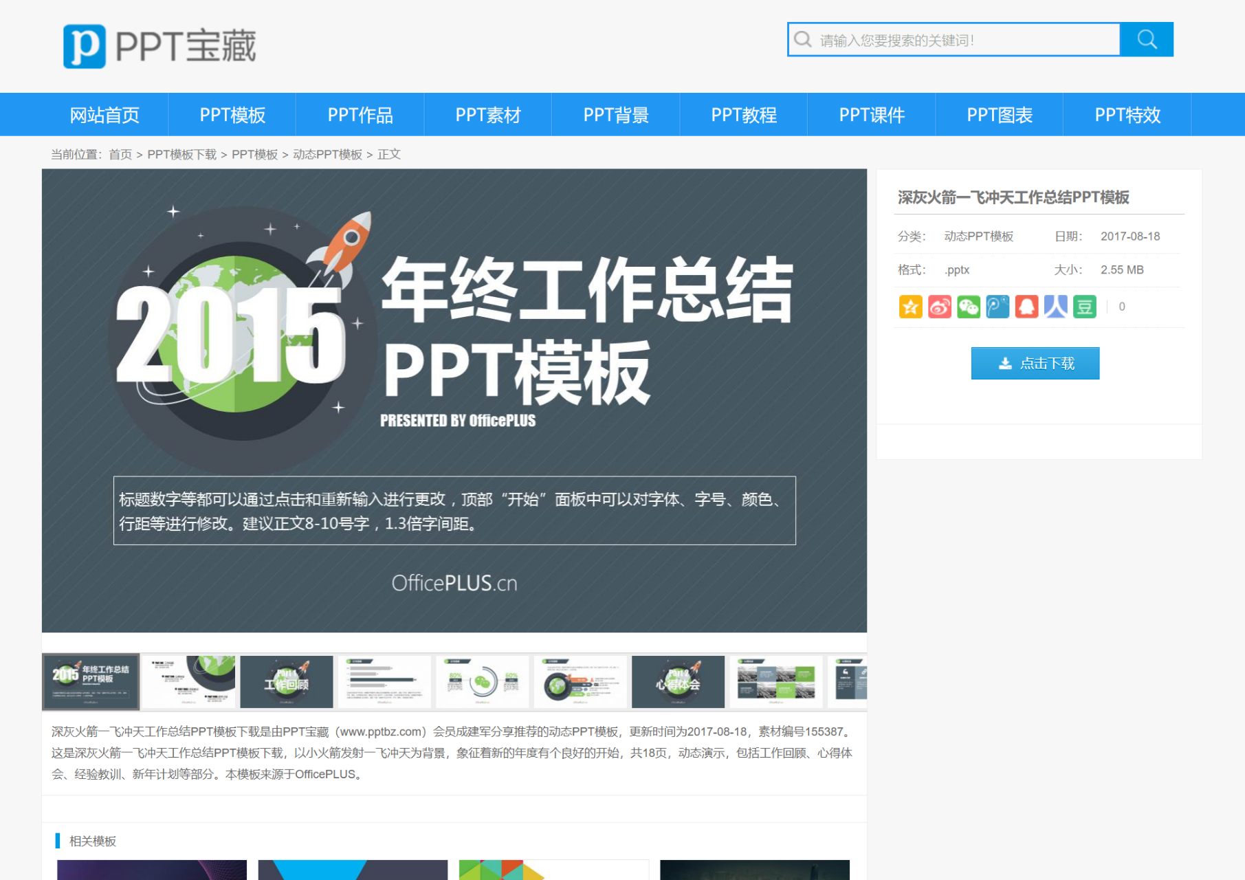 比较有名的PPT模板网站中的一个,历史已相当久远了,跳转到模板的最后一页,可以发现网站最早可以追溯到2011年9月。当然,伴随着庞大数量的,是参差不齐的质量。随便点击一个自己喜欢的模板,拉到底部下载位,进行下载即可。