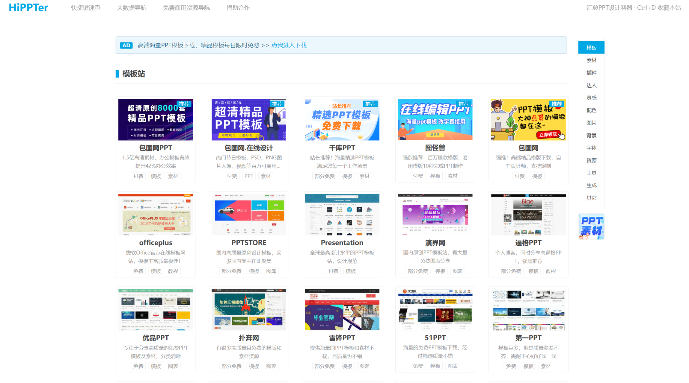 提到PPT模板网站无法避开的一个导航网站,hippter不仅收录了25个PPT模板网站,甚至连网站包含哪些内容、是否收费都给你粗略标记了,而且还有一些万能的素材包和大神作品集,如果打算自己做,网站也提供相当数量的素材站、工具、字体等其他辅助性素材网站或工具。