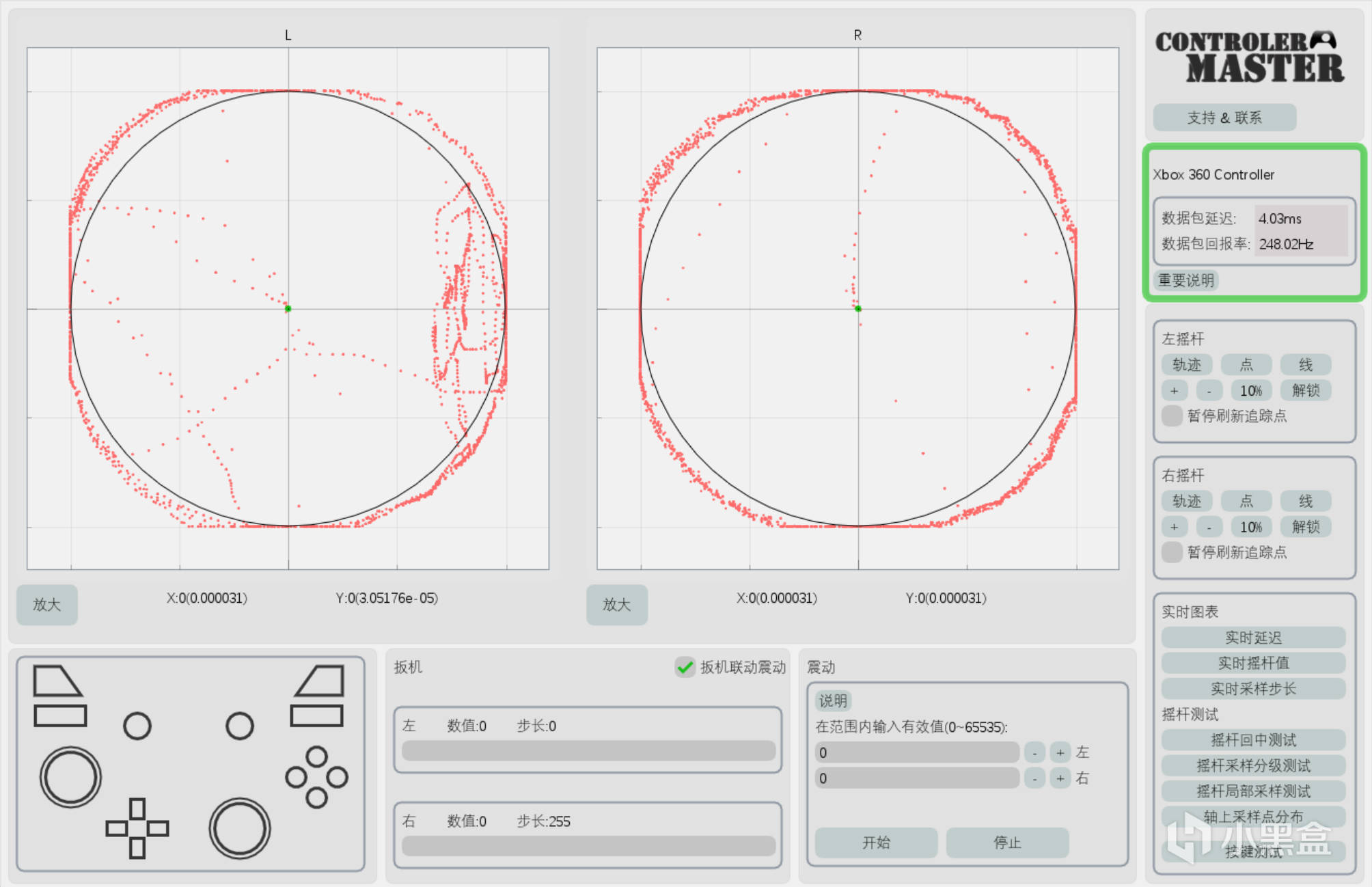 很多手柄玩家可能對回報率這個詞不是很瞭解,你可以簡單的理解爲每秒鐘手柄向電腦發送了多少次數據,這個詞語在鼠標評測中較爲常見。拿xbox和ps手柄做對比,xbox手柄的回報率是125hz左右,延遲在8ms左右,ps手柄的回報率是250hz,延遲在4ms左右。你可以簡單的理解爲這款手柄比xbox手柄快了三倍。