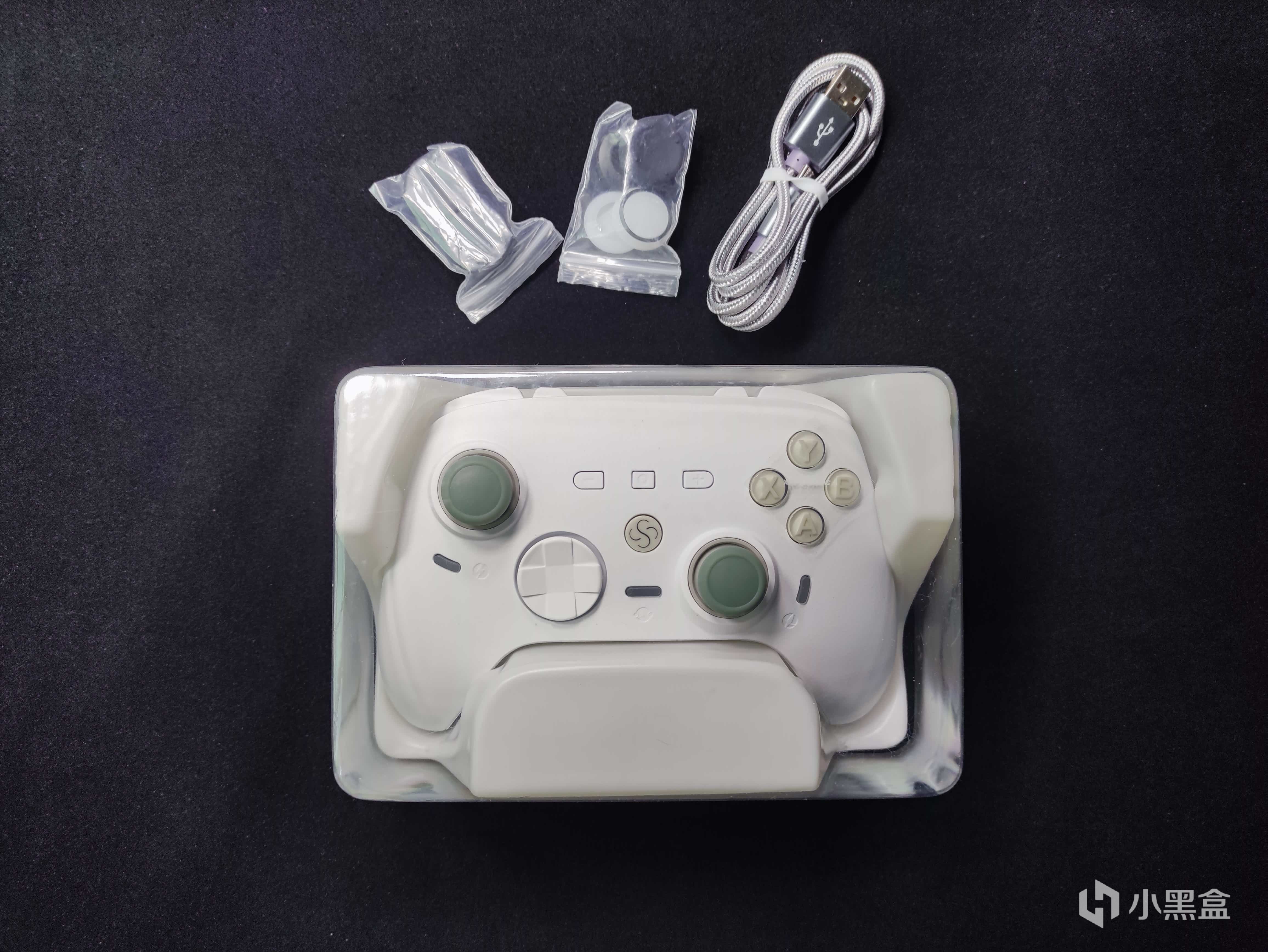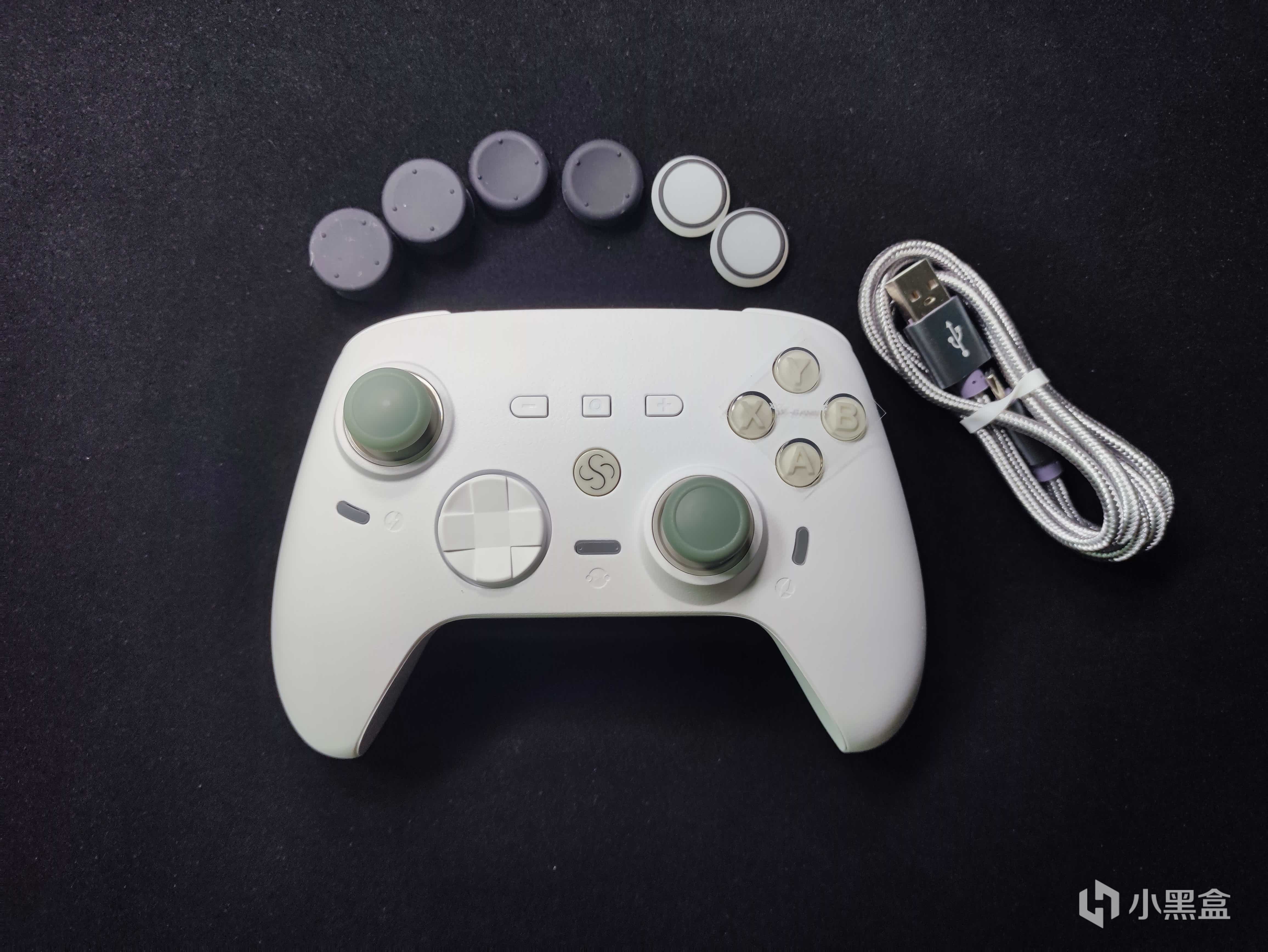 全家福:一根數據線,三對不同高度的搖桿帽,一個手柄。