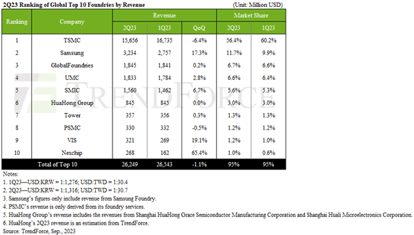 根據集邦諮詢的統計,2023年第二季度全球代工市場上,臺積電以56.4%的份額遙遙領先,不過環比丟掉了3.8個百分點,三星則收穫1.8個百分點來到了11.7%。