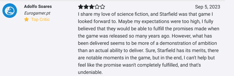 我热爱科幻小说,Starfield 是我期待的那款游戏。也许我的期望太高了,我完全相信他们能够实现游戏在多年前发布时所做的承诺。然而,交付的结果似乎更像是一种雄心的展示,而不是真正的能力。当然,Starfield 有它的优点,游戏中有一些值得注意的时刻,但到最后,我不禁感觉到承诺没有完全兑现,这是不可否认的。