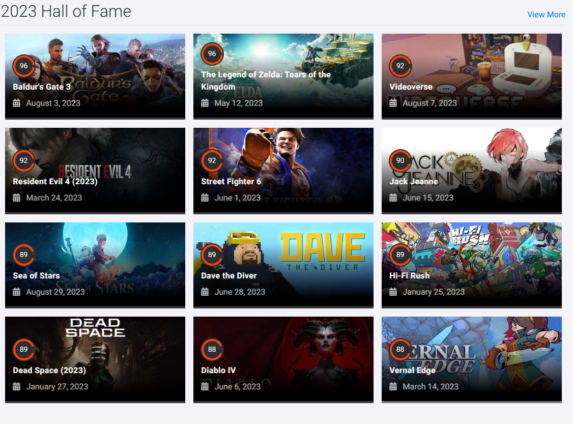 《#星空#》这一分数未能成功进入 OC 站 2023 年名人堂作品名单中,名人堂最高评分的游戏是《博德之门 3》和《王国之泪》,最低需要 88 分才能进入该榜单: