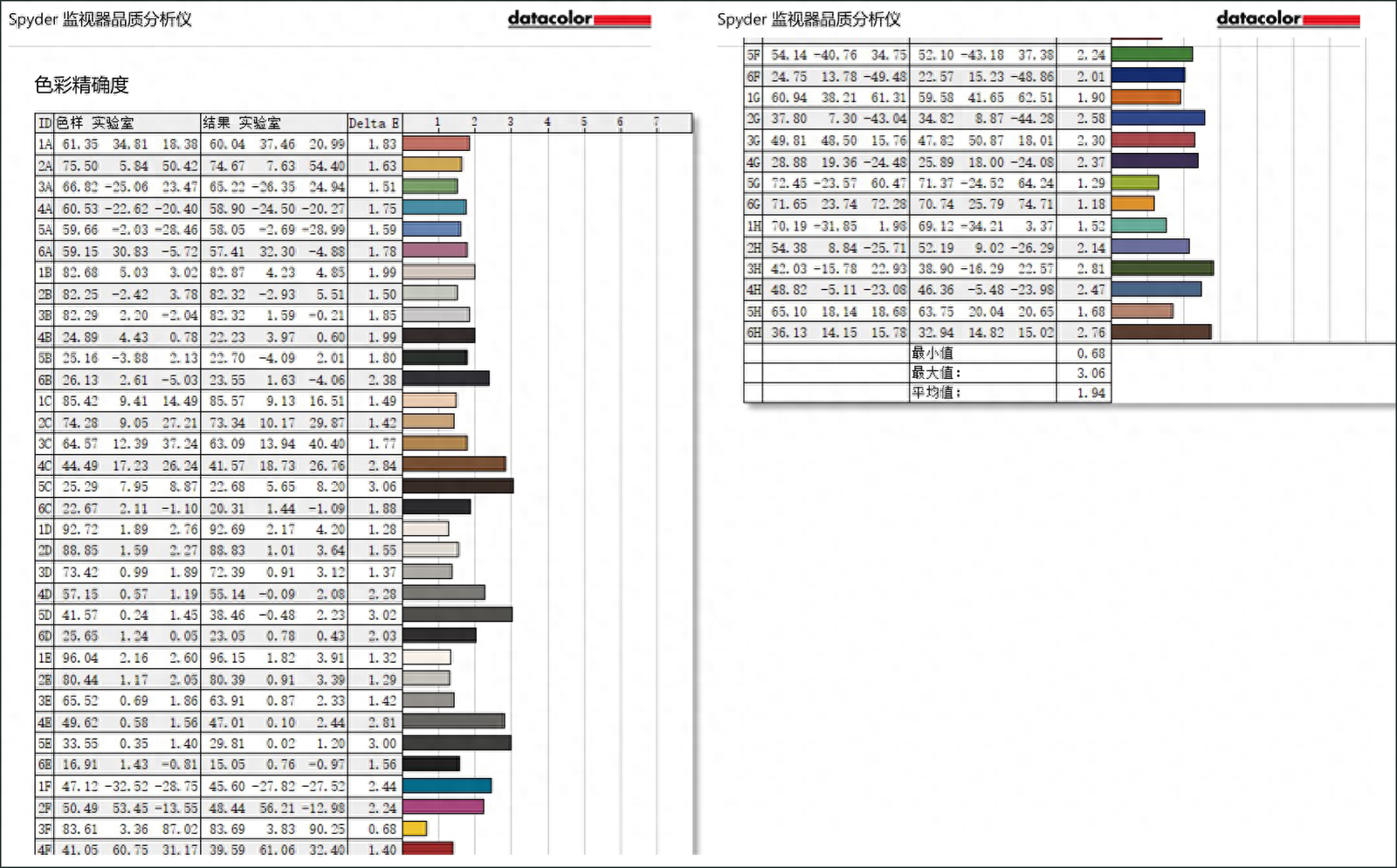 衡量顯示器色彩的最重要的指標就是色準,這也是色彩偏差程度最直接的感受;目前色彩還原準確性採用ΔE值來體現,ΔE值越小,表示色彩精準度越高。德塔紅蜘蛛有三種色卡來進行色準的測試,分別是標準12 色、24 色以及 48 色色彩精準度測試,我們使用最高的 48 色來進行測試,但這並不是使用越多色彩測出來越準確,而是要根據屏幕的色域來決定。