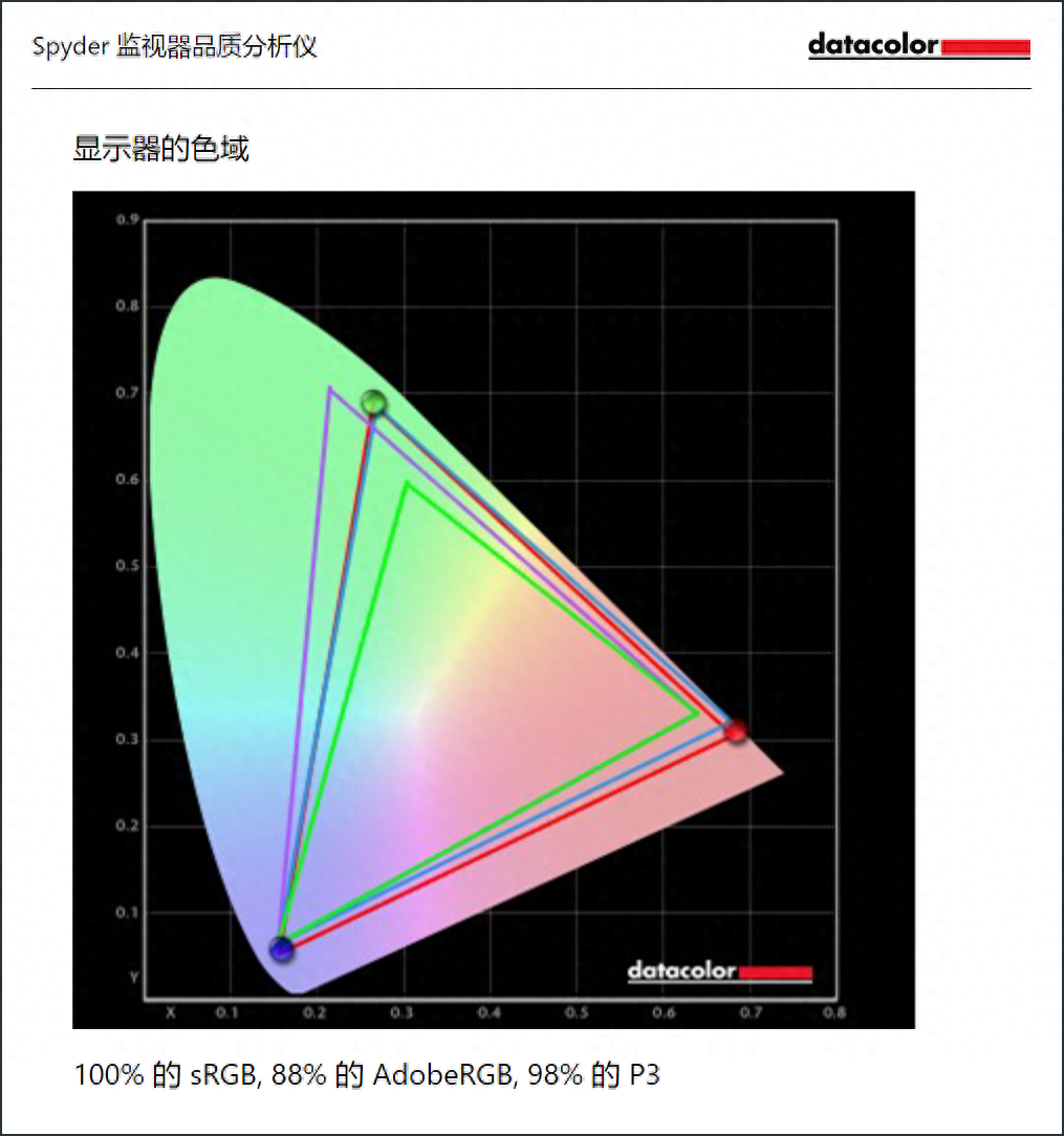 通過Datacolor紅蜘蛛校色儀對顯示器進行色域測試,可以看到在標準模式下其擁有100%的sRGB,88%的AdobeRGB,98%的P3。這個素質在這個價位已經可以說是極佳啦!