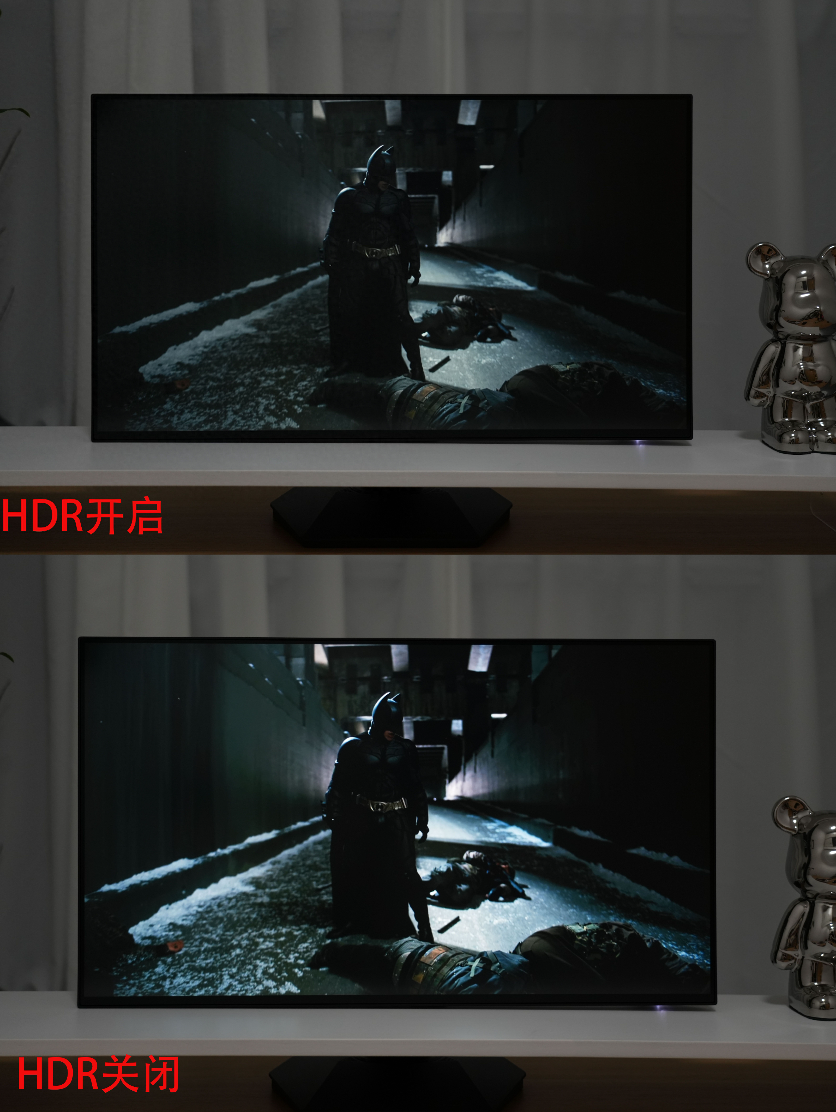 通過觀看《蝙蝠俠:黑暗騎士崛起》,可以看到開啓HDR之後,畫面擁有更寬的色域和更大的色位深度,畫面更加逼真。