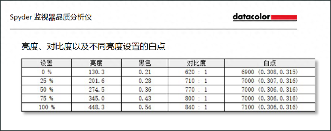 這一部分是測試的亮度、對比度以及不同亮度設置的白點色溫值。