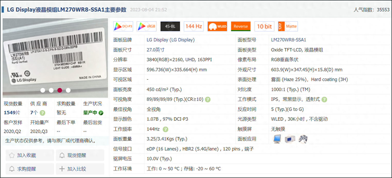 作爲一款旗艦級的高端專業電競顯示器,MG27U搭載的是來自LG的R8原裝面板模組,具體型號爲LM270WR8-SSA1,是LG Display推出的27英寸Nano - IPS屏幕,具有DCI-P3廣色域、144Hz刷新率(OC 160Hz)等特點,該面板可以最高提供450cd/m2面板亮度、1000:1對比度和5ms響應時間,10bit色深,97%DCI-P3色域飽和度,採用WLED邊入光源。
