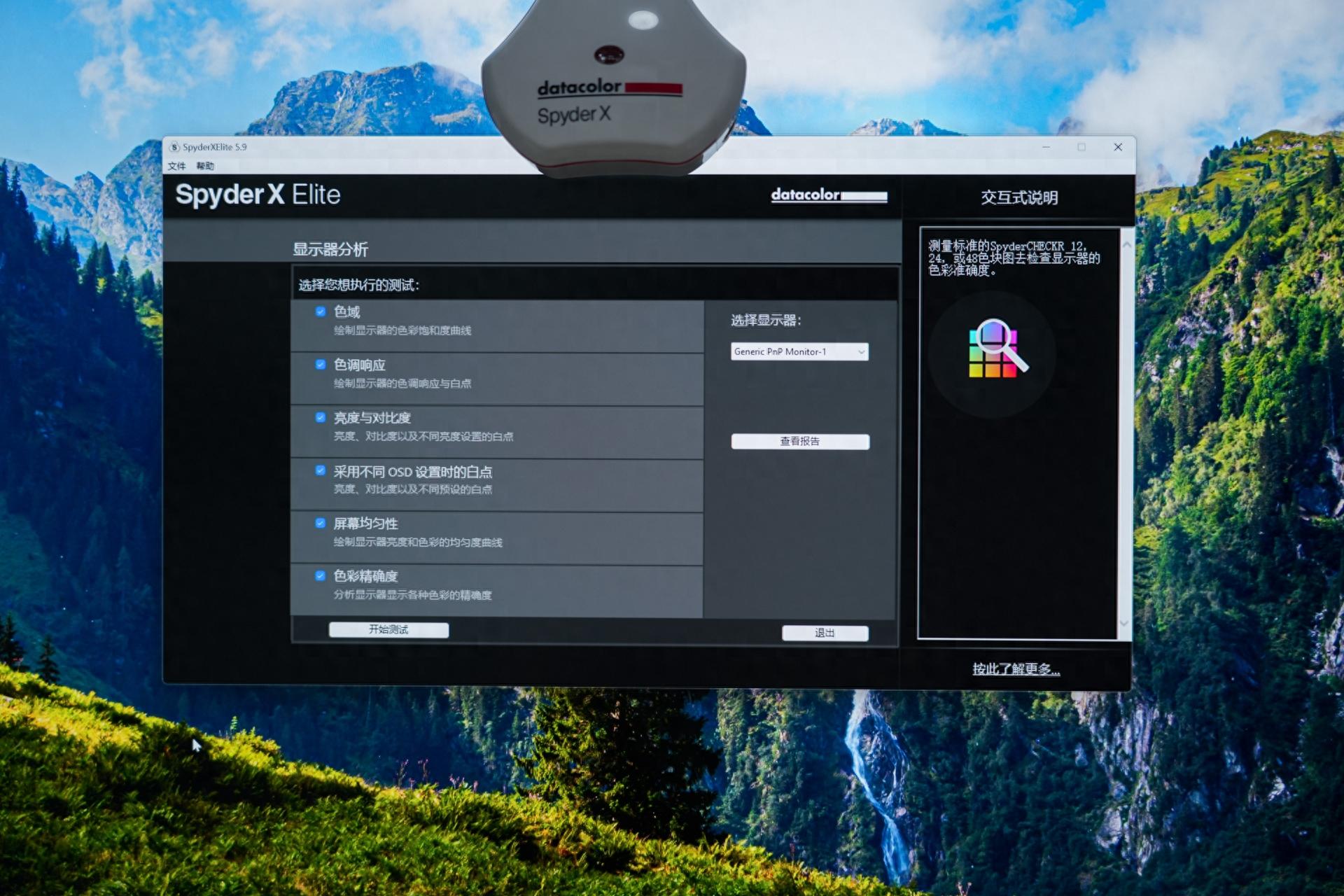 首先進入軟件選擇你需要執行的測試,包括有色域、色調響應、亮度與對比度、採用OSD設置時的白點,屏幕均勻性以及色彩精準度。
