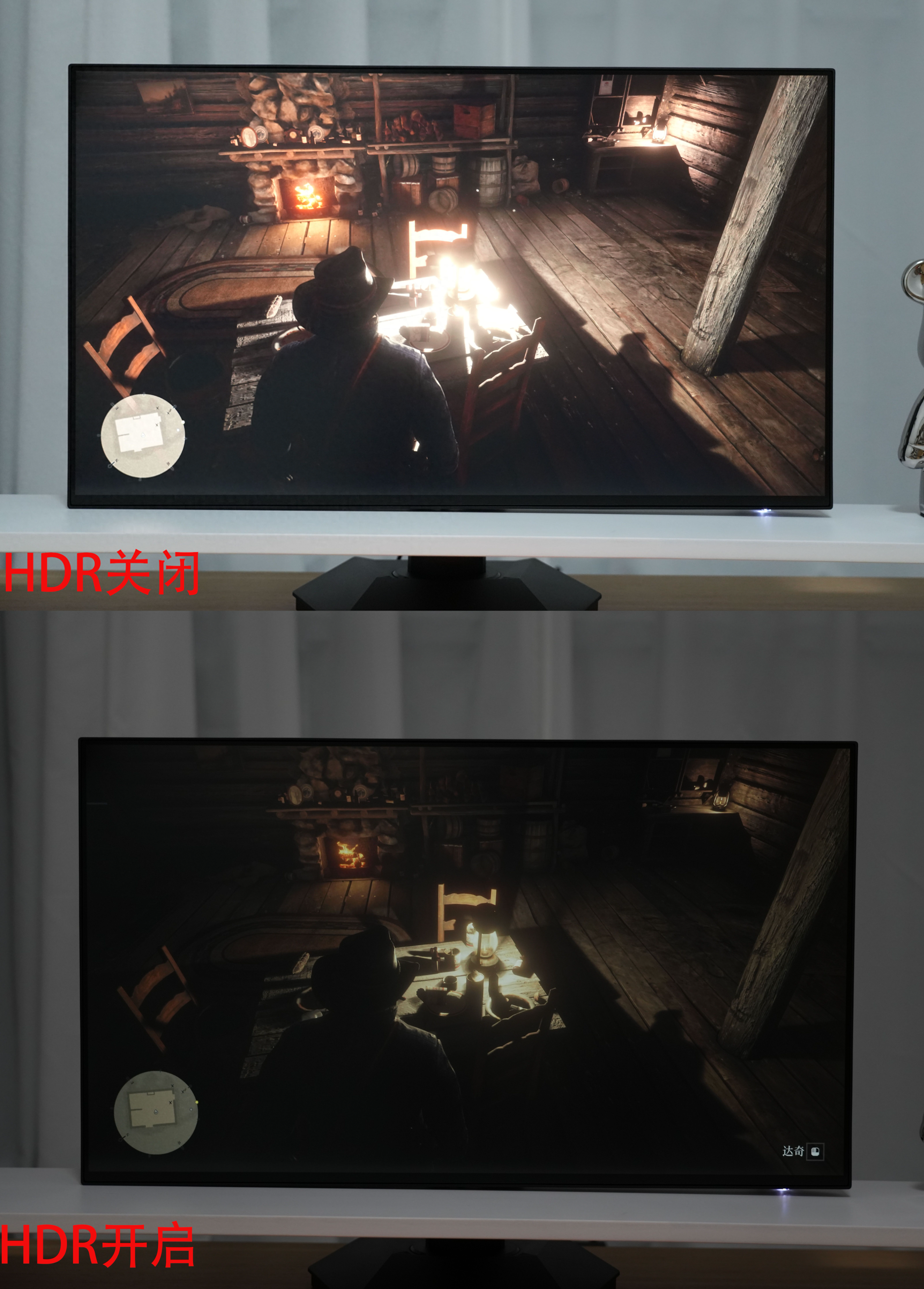通過玩《荒野大鏢客:救贖2》在室內的燈光前面可以看到,開啓HDR之後,細節與顏色更加到位。