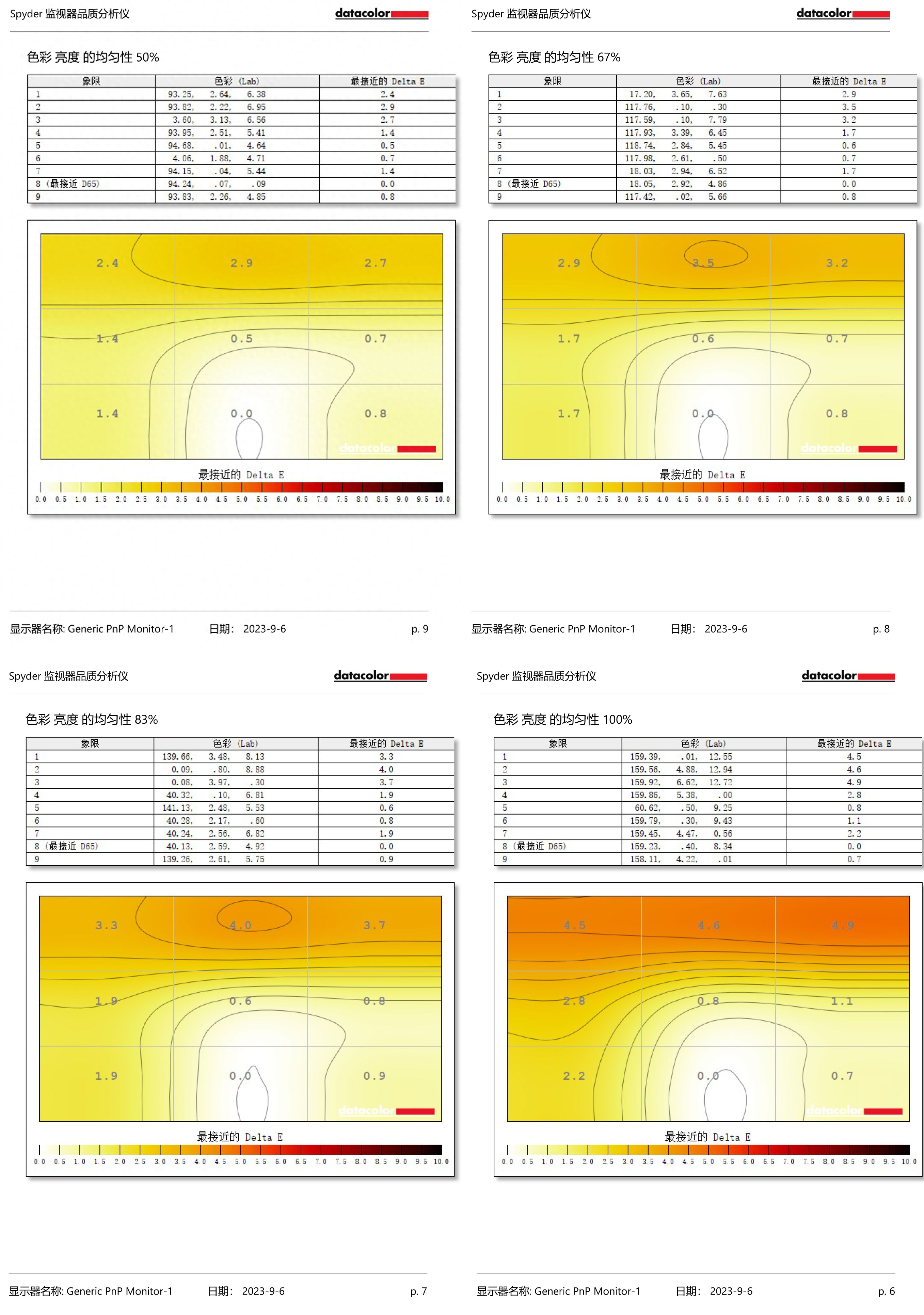屏幕均勻性測試是對屏幕每個區塊屏幕明度、色彩值進行測試,黃色區域代表明度、色彩值與標準值的差值,其中差值越大顏色越深。在測試環節,Spyder5Elite校色儀會將屏幕劃分爲9個區塊,校色儀測試不同的色度下的最大差異值比並記錄。