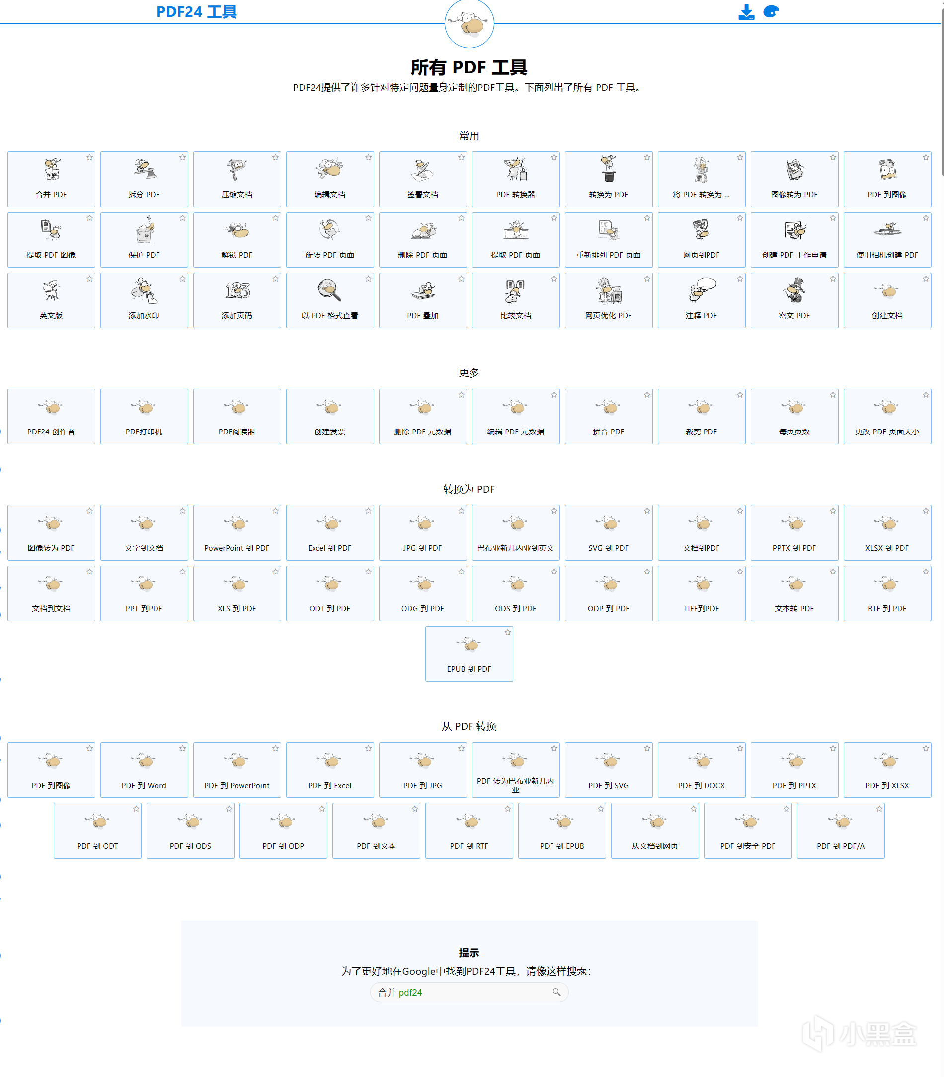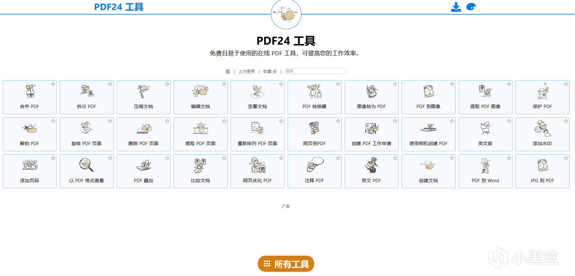 其实大部分学校并没有这个部分,但说好的一条龙服务,有些学校的老师还是会有这种奇怪的要求的,将小组作业的文本部分转换为PDF然后发给老师进行留档,且全组放在一起,这时候就会出现两种情况,分别是不会将文本文件转换为PDF文件,另外一种则是有着几份各个组员的PDF文件却不知道如何组合在一起,这两种方法在某办公文档中都是付费功能,这怎么能行?于是PDF24出来拯救你了,其首页有着较为常用的功能,基本已经可以满足大部分的使用了,但是如果你表示,不行啊,这没有我需要的啊,别急,你点开所有工具。