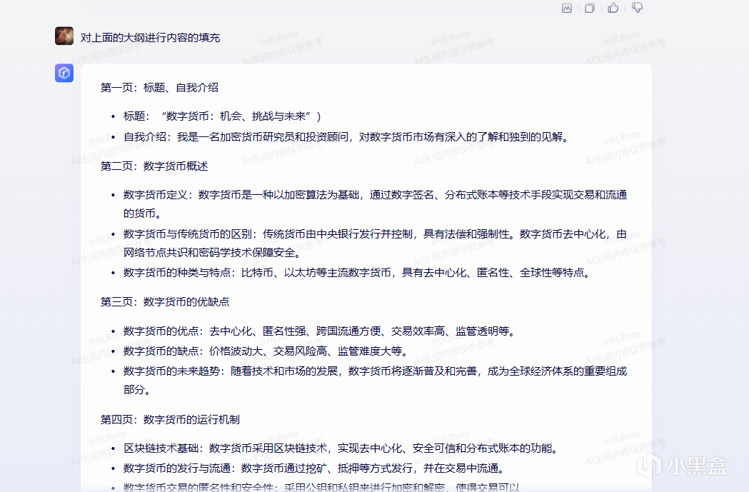 而在其将大纲列好后,确认大纲内容较为符合心意,那么就可以和我配图一样,要求其进行填充,可以看见去填充的内容言简意赅,用于PPT是很适合的。
