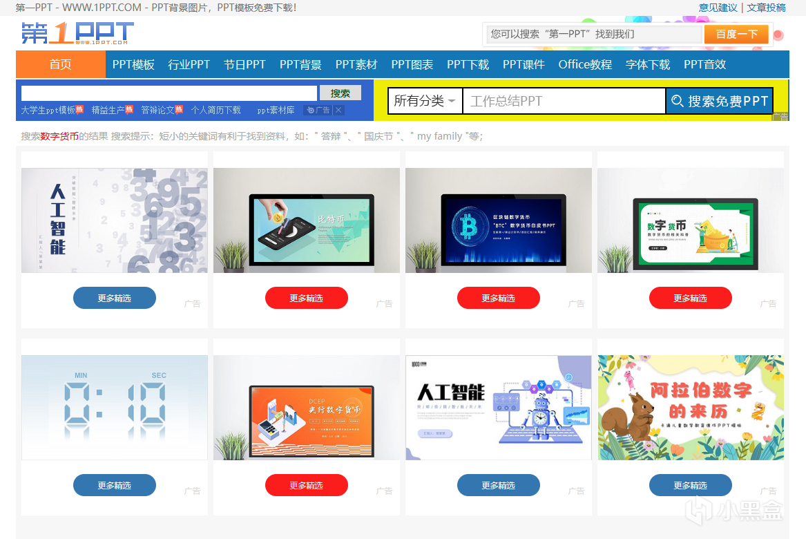 很多的所谓的免费PPT网站,进去以后实际上还是要去充值会员才能使用,而学长我作为老穷鬼怎么可能去充钱呢,而不充钱的网页大部分又万年不更新或者其本身的模板极其稀少,于是在不断的找寻下,我找到了这个——第一PPT,他们家的模板全是免费的,且有着大量的模板可供使用,依然是以数字货币为例,通过搜索可以发现,其有着大量与数字货币以及人工智能相关的PPT,将其模板下载后套上上面获得的大纲及基本内容,基本就已经可以完成工作了,而到这里,总花费时间不会超过五分钟,相比较起很多同学的全蓝配白字的辣眼组合,白底加黄字的看不清组合,你的PPT绝对算是中上之姿了。