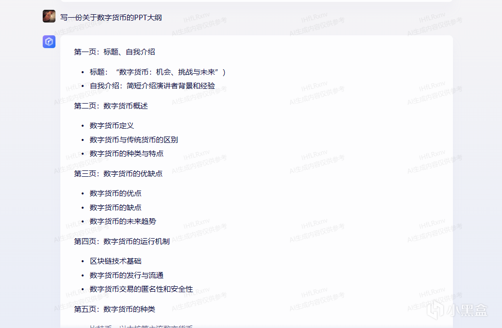 相信很多小伙伴的老师,对于小组作业几乎是只会给一个标题,而其他所有部分都需要自行去完成,这就需要花费大量的时间去编写相关的内容,而如果只有一个人的话,这个工作量还是比较大的,那这个时候,就需要一个博览群书又懂得大纲格式的好伙伴出手了,没错,我说的就是AI写作助手,有条件的小伙伴可以使用ChatGPT或Bingchat来完成这部分工作,但如果不想麻烦的话,其实百度的文心一言也是非常不错的选择。图片上展示的是我的示例,通过要求其写一份关于数字货币的PPT大纲可以发现其本身所写的还是非常清楚明白的。