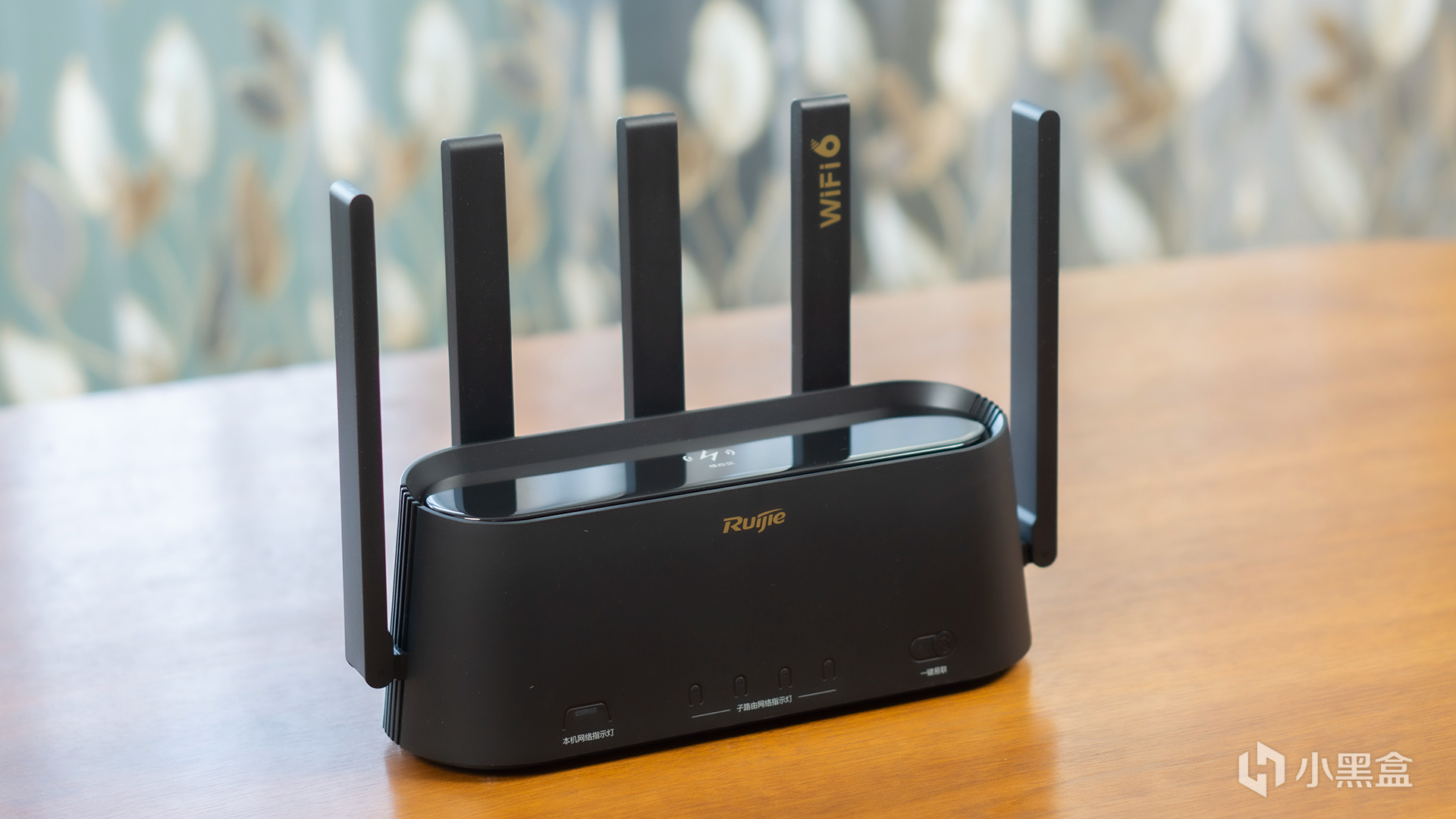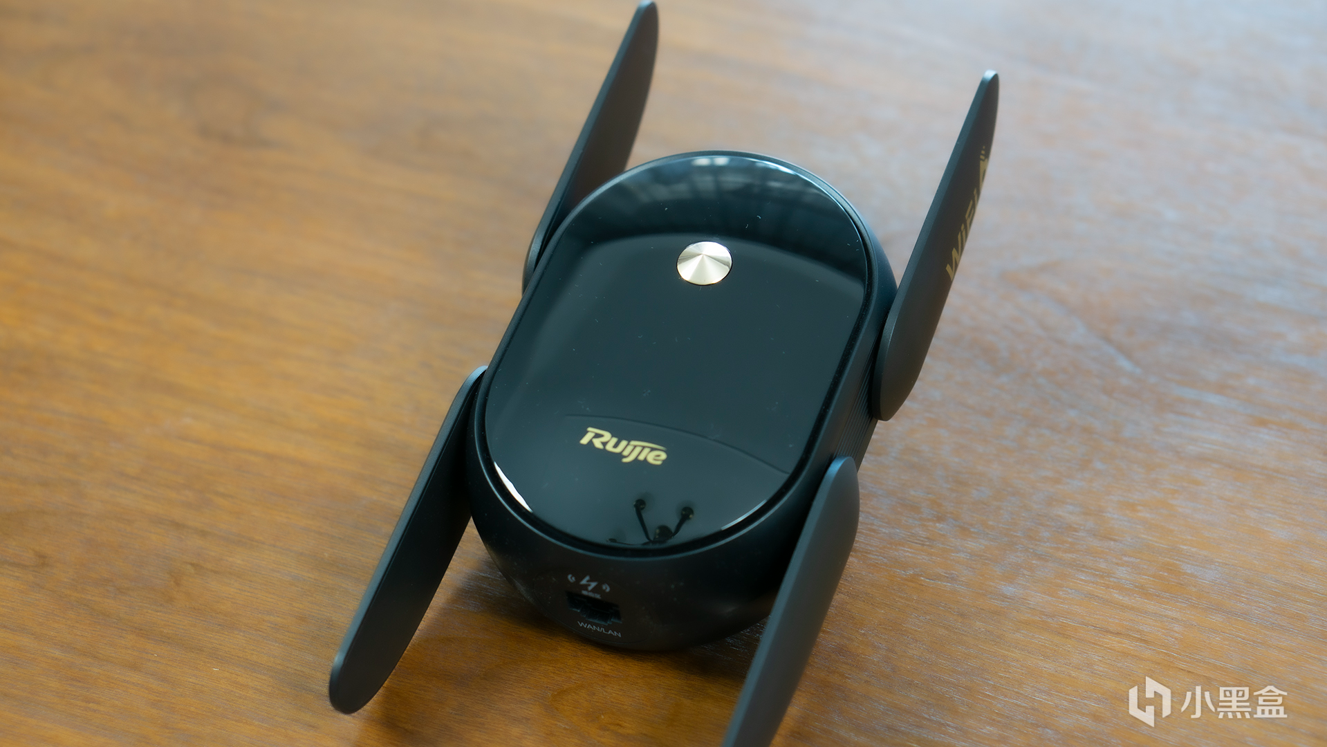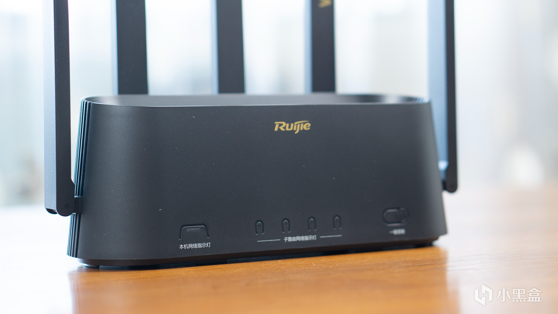 子路由的正面有一個金色的裝飾釘,下面是銳捷的英文LOGO,整體是亮黑配色,挺百搭的。LOGO上方有一個指示燈,綠色快閃爲設備啓動、重置、升級,綠燈慢閃爲正在組網,綠燈常亮爲信號良好、橙色爲不佳、紅色爲失聯。