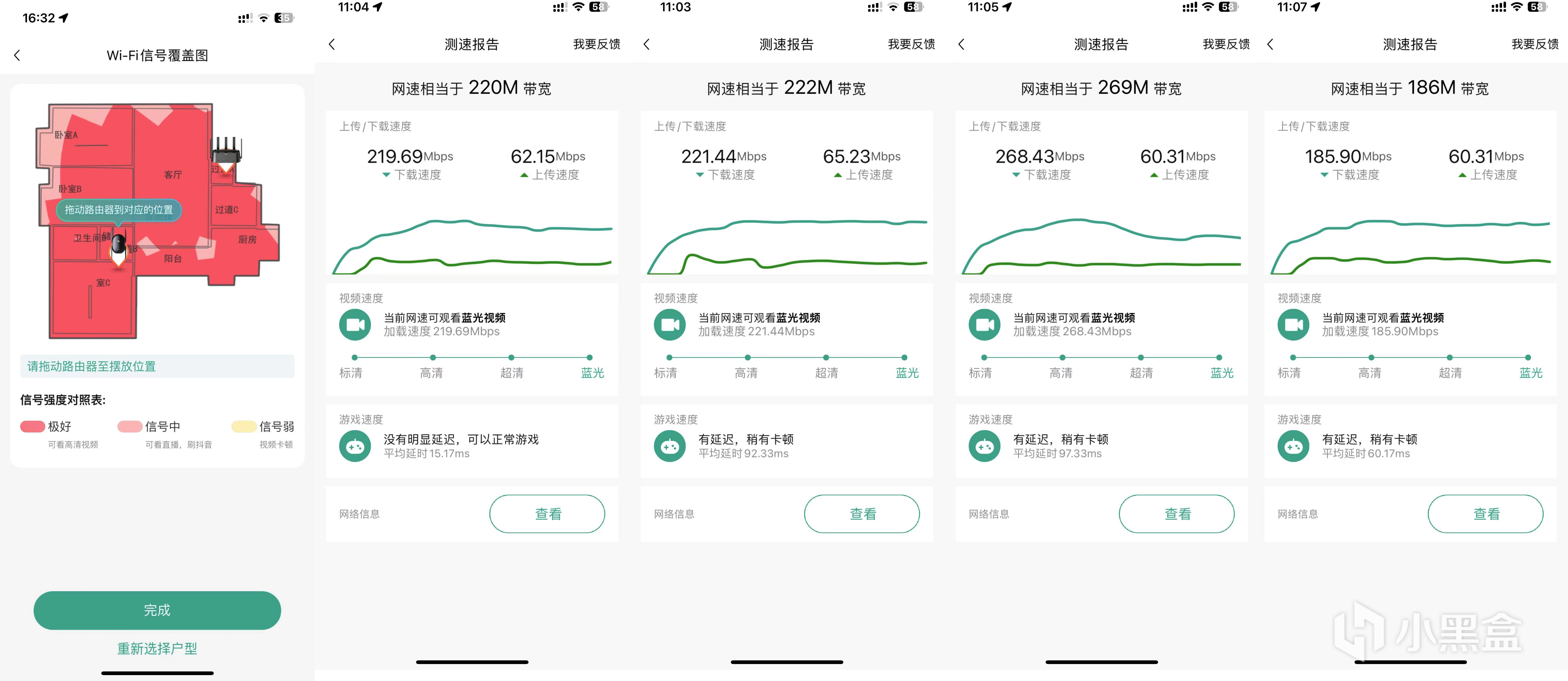 我家是200M寬帶入戶,從效果圖和在客廳及臥室A、B、C四個房間實際測試的結果來看,除了最遠端的臥室速率略低外,其它房間均接近實際300M的帶寬。特別是兩牆以外的主臥,之前完全沒信號,如今已經不再是信號盲區了!信號直接滿格!不論是遊戲還是刷劇,都非常的方便。