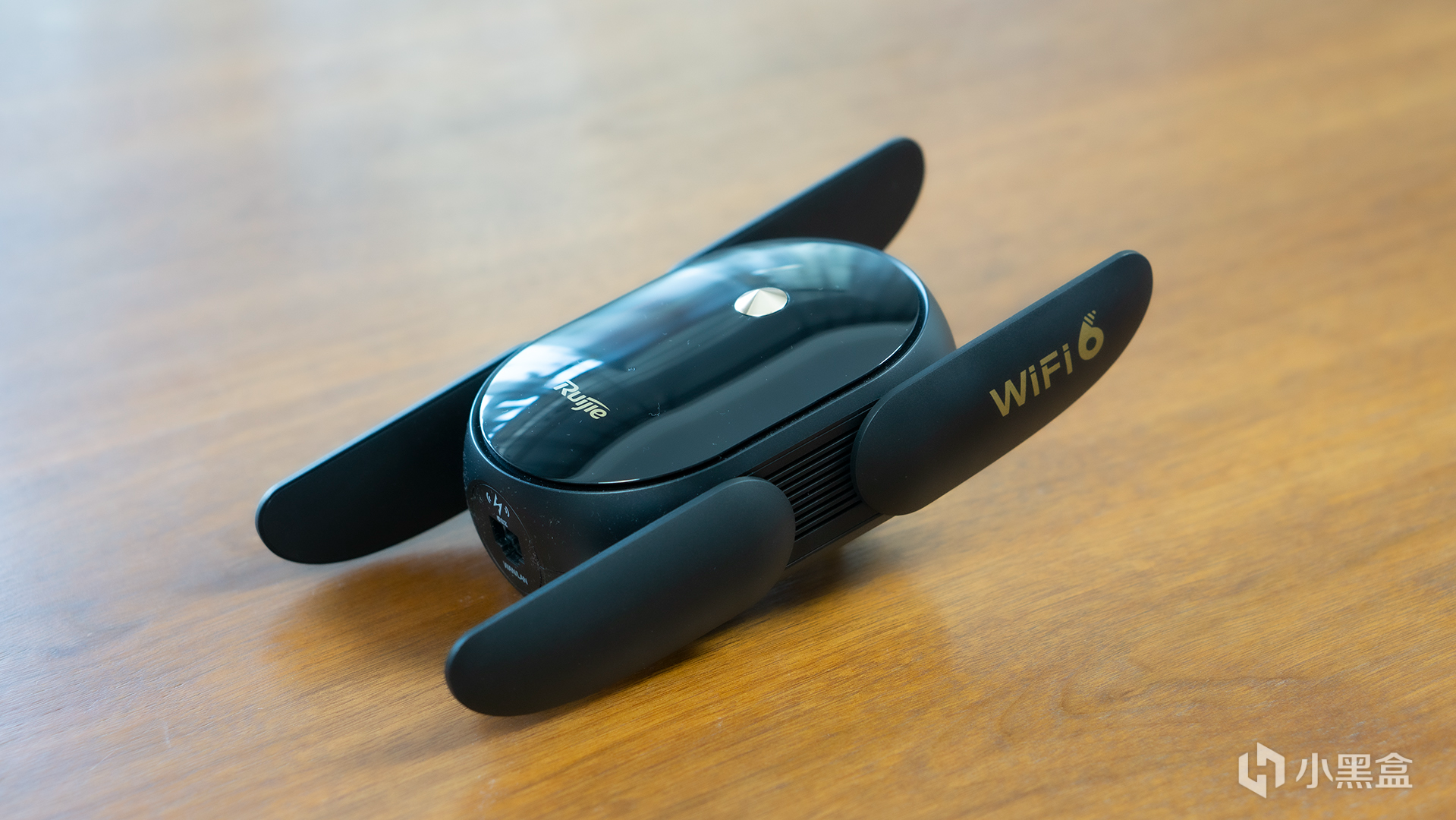 與母路由器的端莊不同,子路由珠圓玉潤的造型總帶着一點點的頑皮。雖然是子路由,它同樣附帶了四根外置的雙振子天線、一根內置天線及5顆高功率FEM內置信號放大器,支持2.4及5G頻段,最大無線傳輸速率同樣爲3000Mbps。