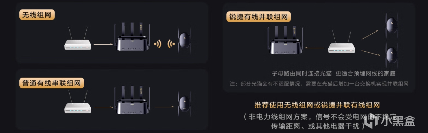 銳捷蜂鳥旗艦版子母路由器的連接方式如上圖三種,由於光貓在門口,主臥沒有網絡,因此我使用的是無線組網方式。