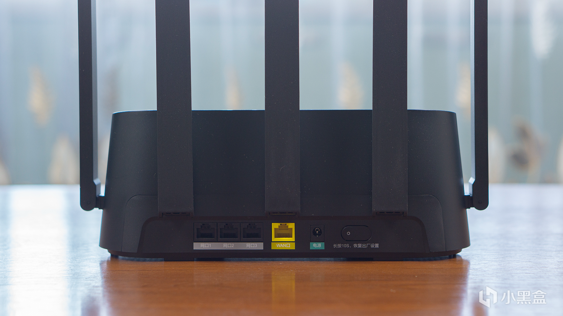 它的背面從左到右依次爲3個LAN口(千兆),一個WAN口(千兆)、一個電源口及一個重置按鍵。