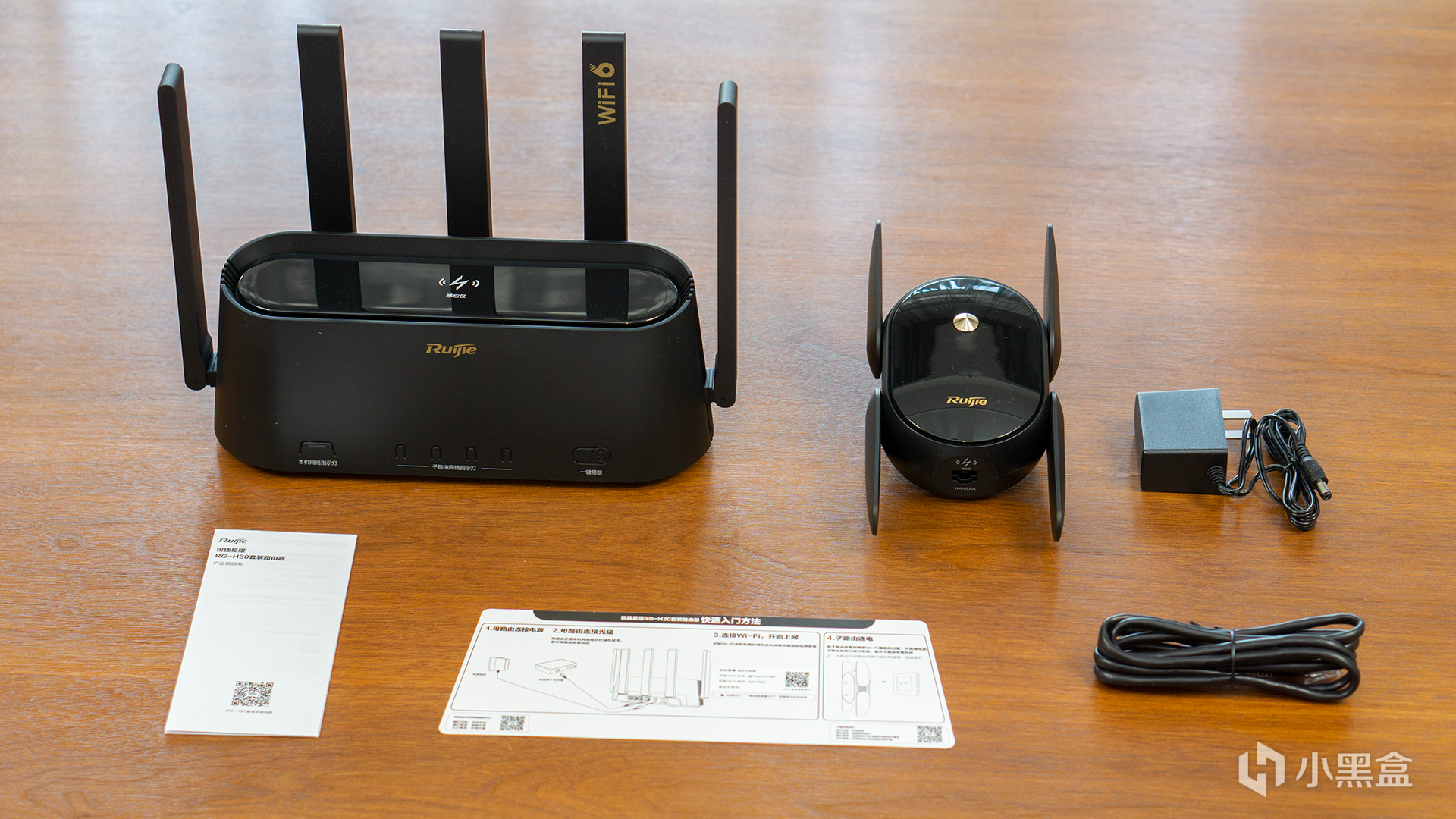 這是全家福,從上到下從左到右分別是銳捷蜂鳥旗艦版母路由、子路由、電源、產品說明書、快速安裝手冊及一根網線。