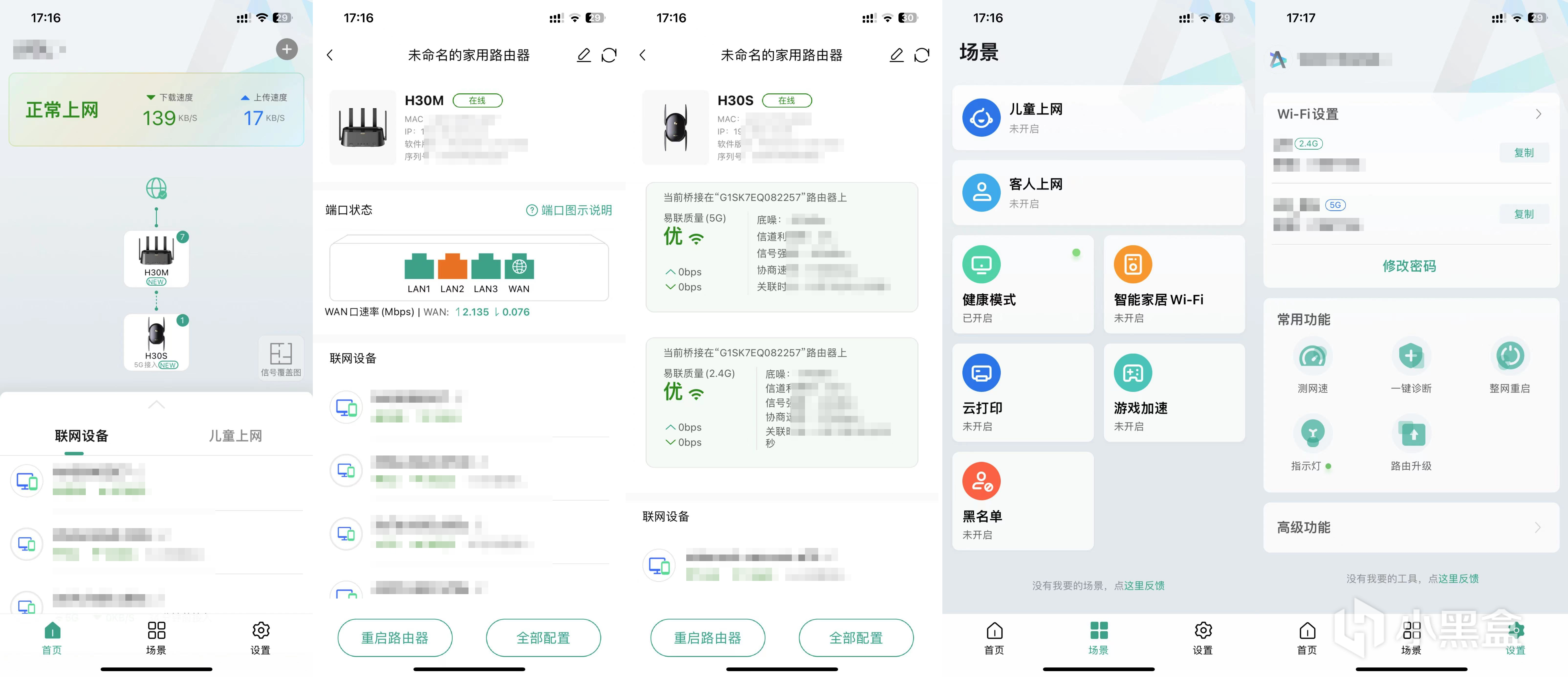 這是一款能夠做到全屋覆蓋的子母路由,它的強勁性能已經足夠讓人滿意。同時,它還是一款有着豐富功能的智能路由。它包括了兒童上網、客人上網、健康模式、遊戲加速、黑名單等常用功能,還附帶了智能家居Wi-Fi、雲打印等高階功能,它幾乎預設了小夥伴們日常所涉及到的所有常用場景。