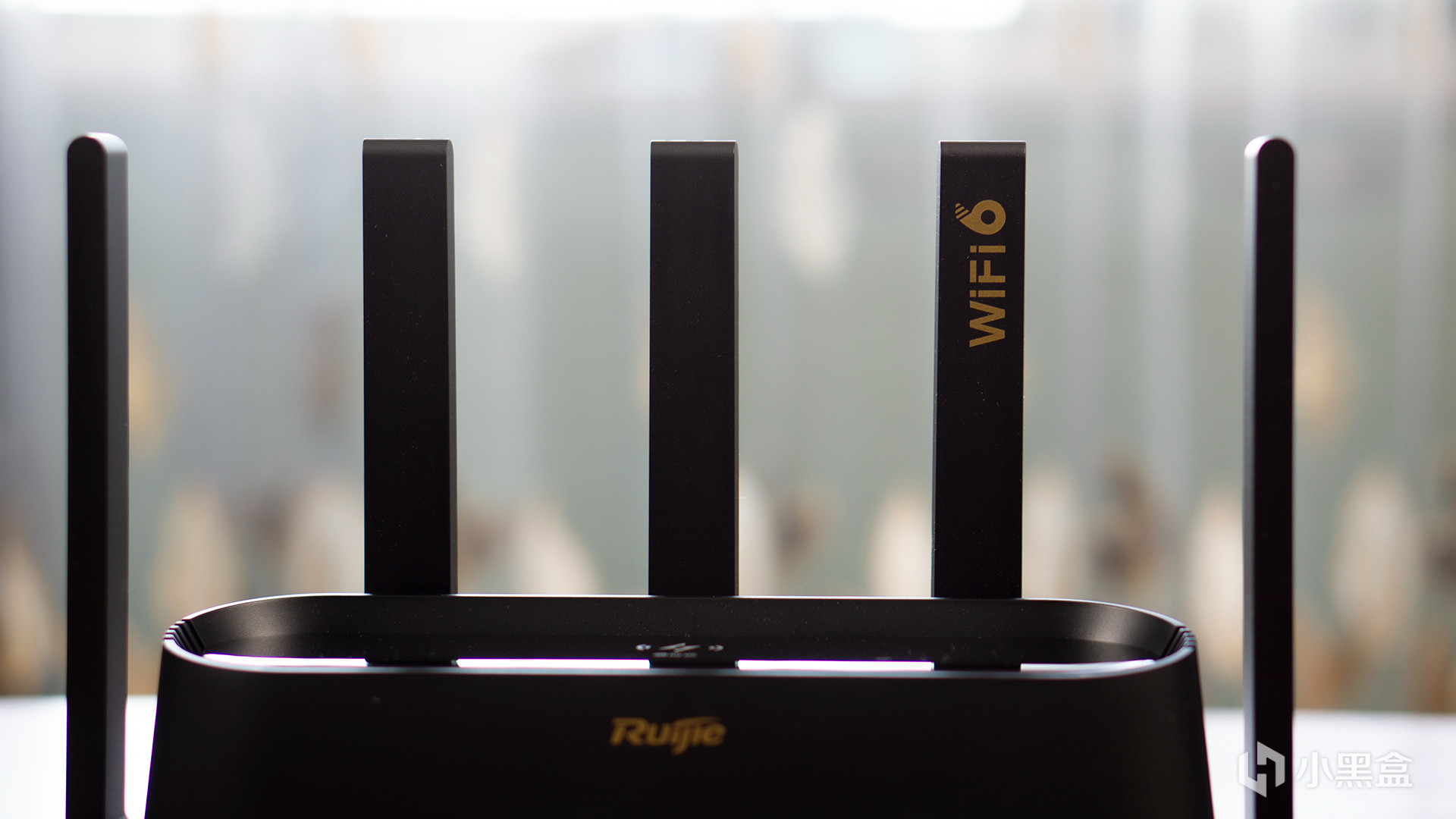 銳捷蜂鳥旗艦版子母路由器的母路由,外置了五根4振子天線,每一根都相當的粗大(狗頭),其中一根上的一個大大的WIFI6,告訴着我們它的傳輸速率可是不含糊的。