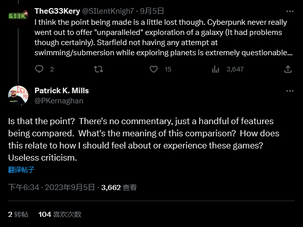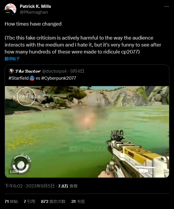 《赛博朋克2077》高级开发者 Patrick K. Mills 在推特上回应了一个将《星空》与《2077》对比的视频。视频对比了两款游戏中玩家在书中游泳、手雷爆炸,以及 NPC 在被武器指着时的反应等。整体上,视频似乎是对《星空》的批评。