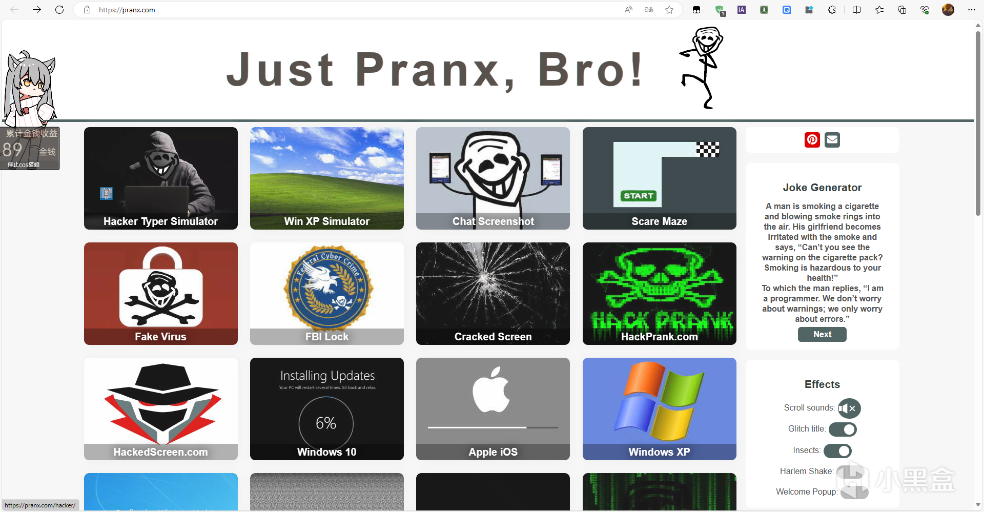 一個可以模擬很多頁面的網站,比如黑客、WINXP系統、碎屏、WIN7更新等等,快趁你朋友上廁所的時候在他的電腦上打開吧!(使用F11全屏網頁效果更佳)