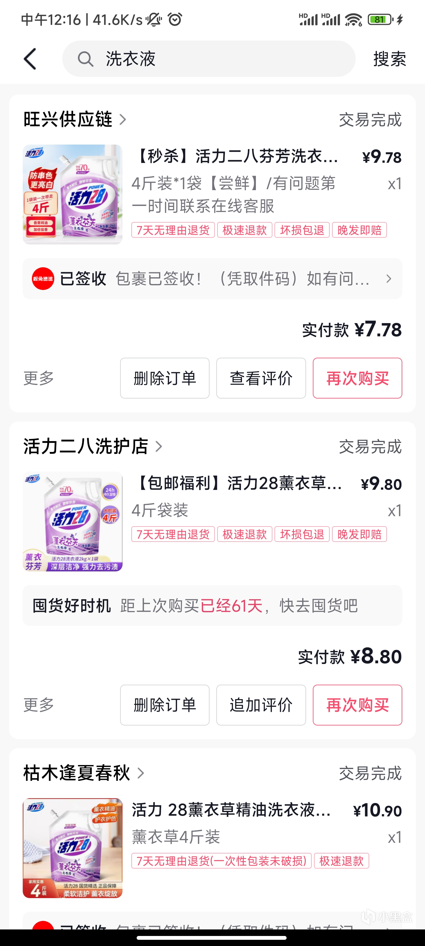 一般来说品牌都会有溢价,对于一般的生活快消品也没必要讲究品牌,能用就行。比如蓝月亮洗衣液,真的很贵,我一般用“活力28”。活力28洗衣液便宜很多,4斤打折时不到10元,而且质量也不错。本身上个世纪90年代就是畅销全国的品牌,后来没落了,现在重新开始发力了!