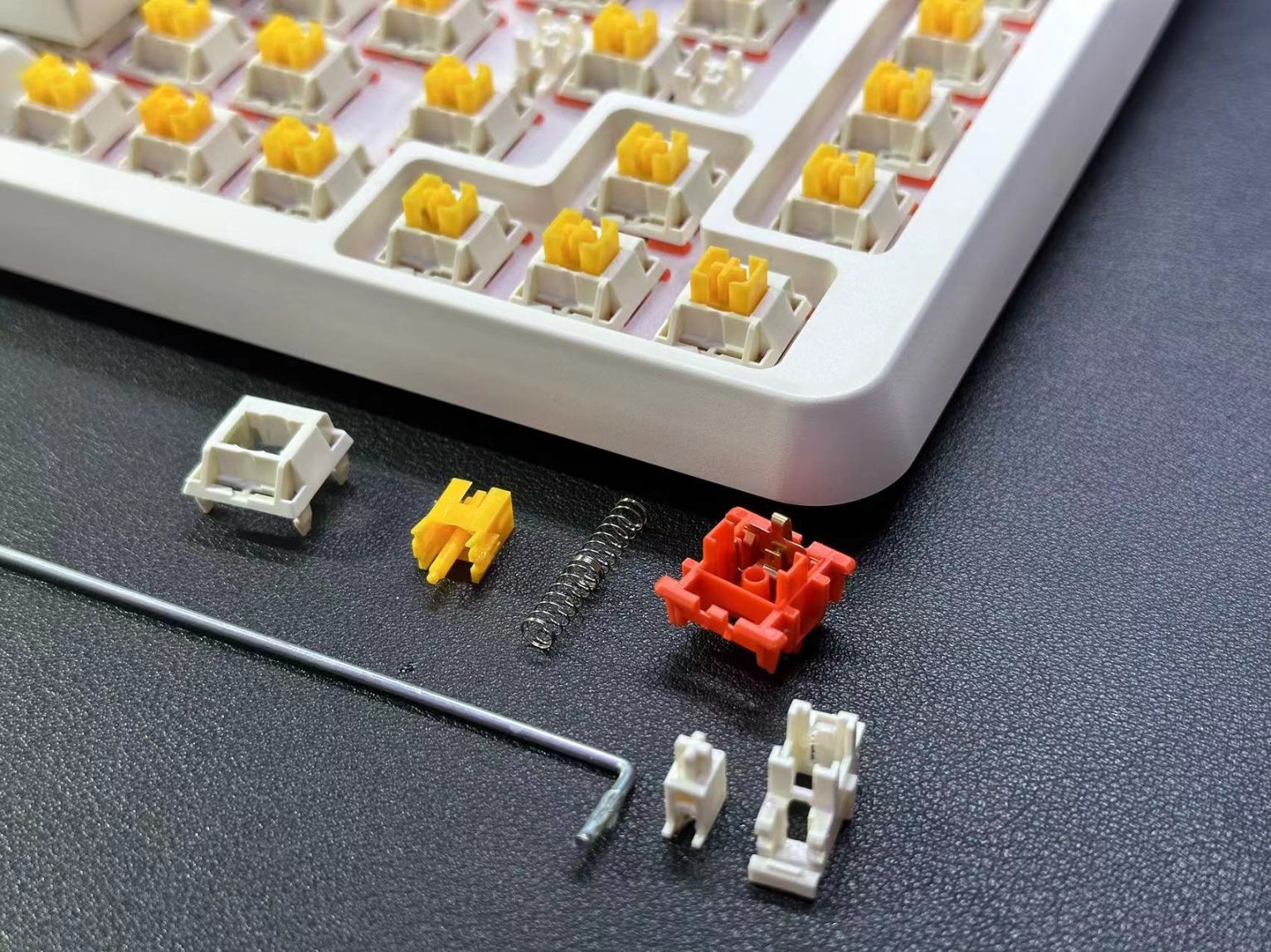 X75的轴体是小霸王自己找海木代工的小霸王红轴。轴体上盖下盖都为尼龙材质,轴芯为POM材质,弹簧采的是22mm的双段弹簧。润滑情况:轨道,小爪,弹簧都是给了润滑,轴体顺滑程度是非常不错的。