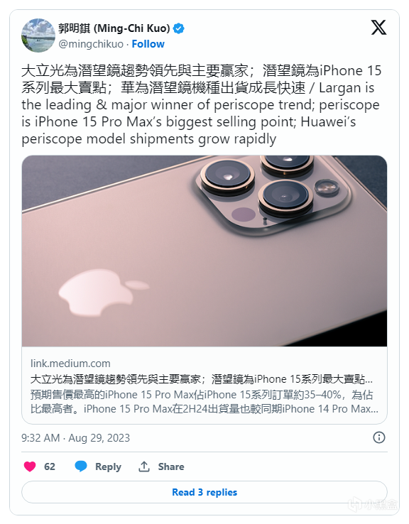 iPhone 15 Pro Max潜望镜式镜头采全新混合镜头设计,预期能够实现6倍到10倍光学变焦能力; 在苹果设计的潜望式镜头系统中,可能包含了一个混合镜头组(1G3P)、一个平行四边形棱镜(并非典型的三角棱镜)、两个致动器(包含一个新球型 VCM),以及一个 CMOS 影像感测器(CIS)。