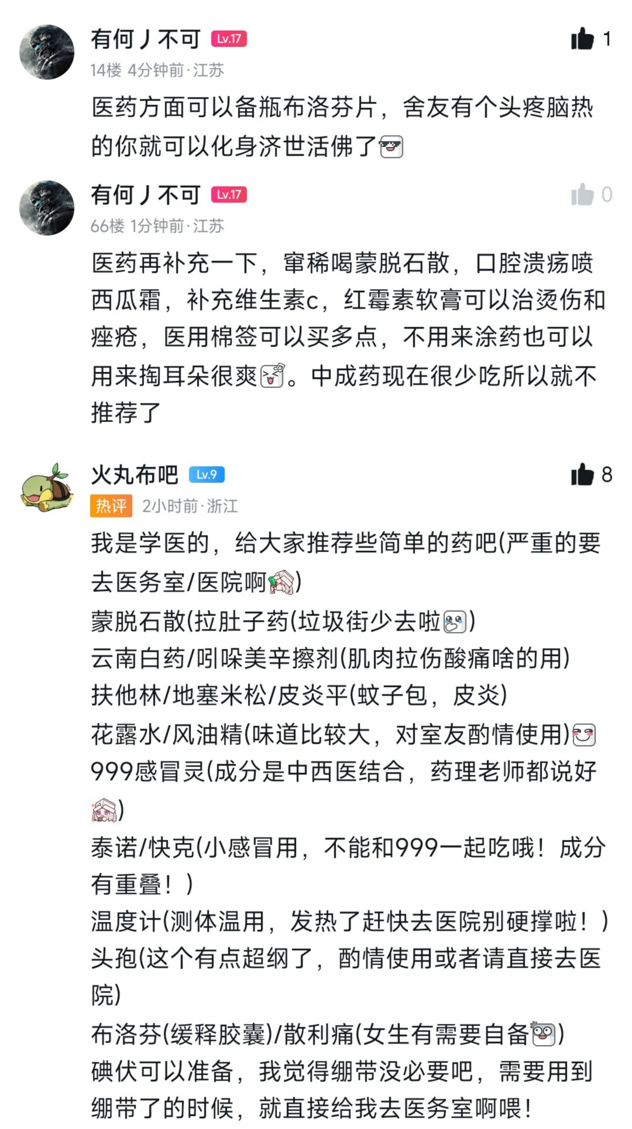 “上篇”中有很多盒友都分享了自己使用的小物品,摘取了一些加入到“下篇”中作为补充,还有医学的盒友科普了一些常用药物或非处方药(感冒灵,布洛芬之类的),但是大家不要滥用“药物”乱吃药哦。部分盒友看病多了(绝对没诅咒人的意思)有了些许药物相关的知识所以可以去药房去医务室自己对症下药,如果没相关常识或知识的盒友就不要尝试了。