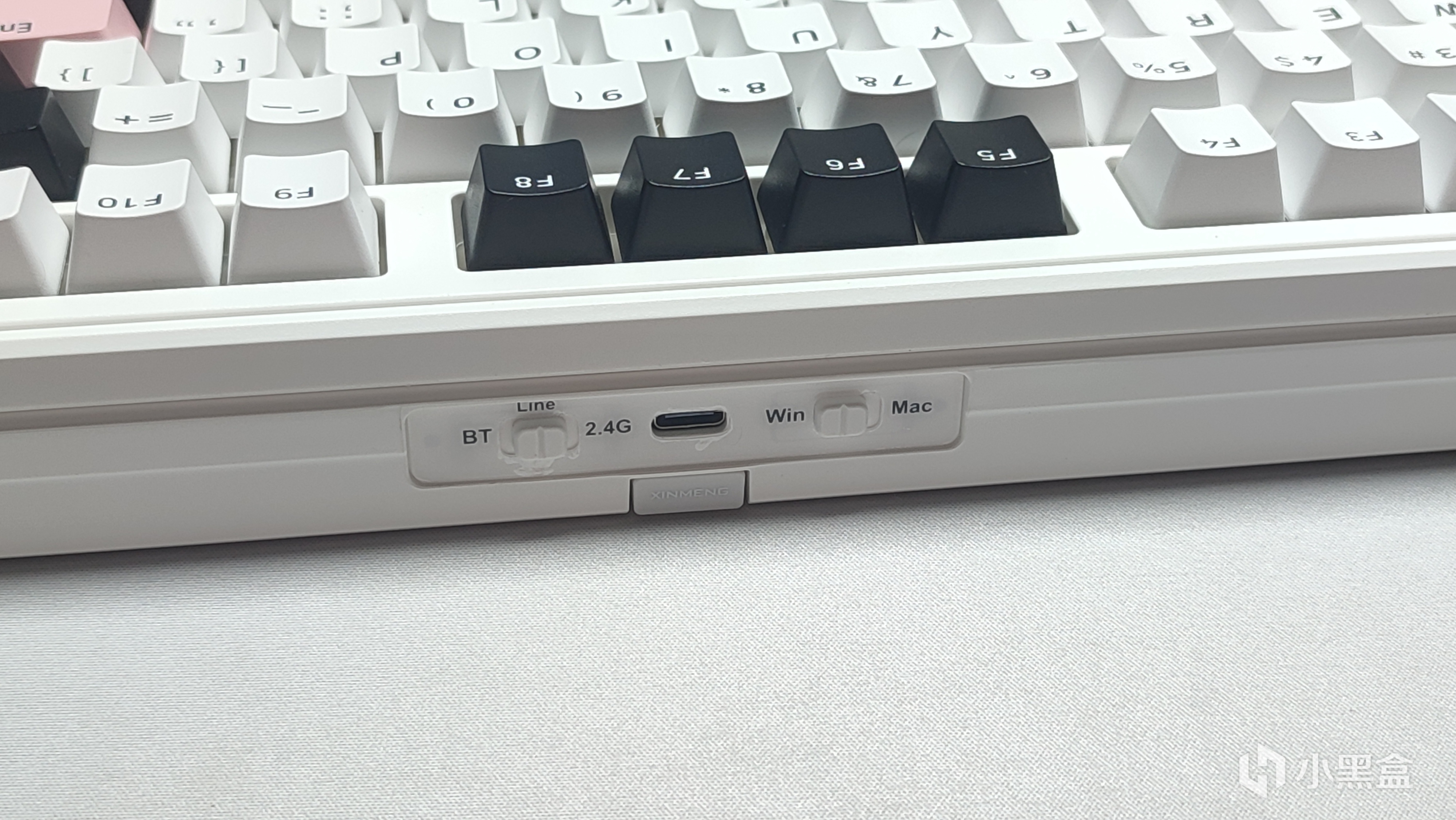 后侧面能看到实体切换按钮以及接口,都做到了中间,下面是接收器收纳仓的位置,日常使用想拿出来还是需要将整个键盘抬起,同时这个收纳仓没有做磁吸,靠接收器以及外壳卡住。