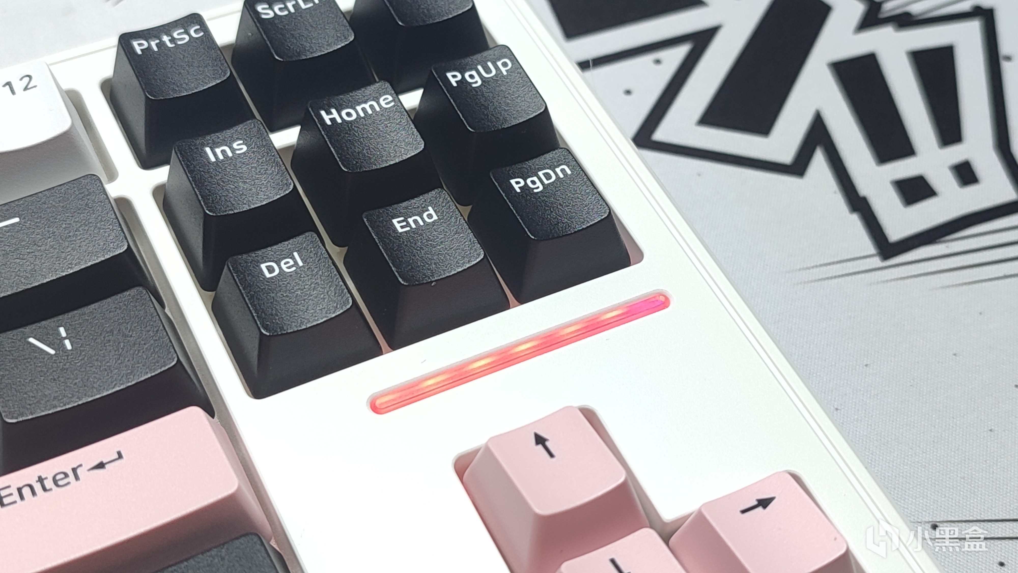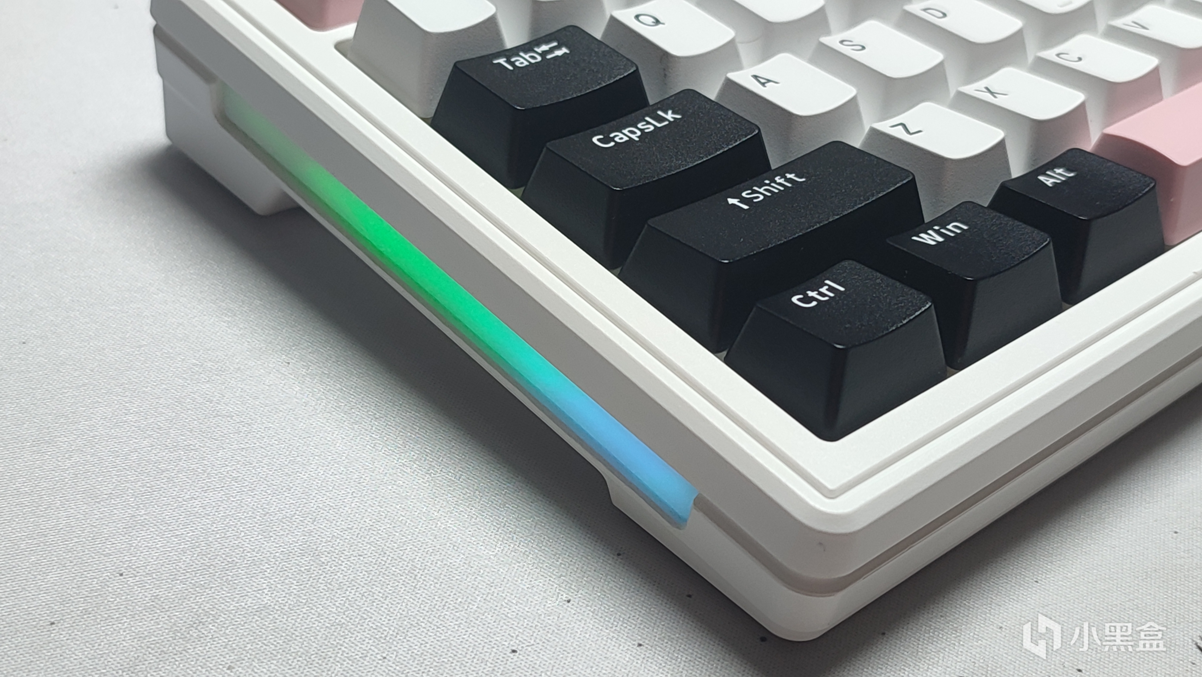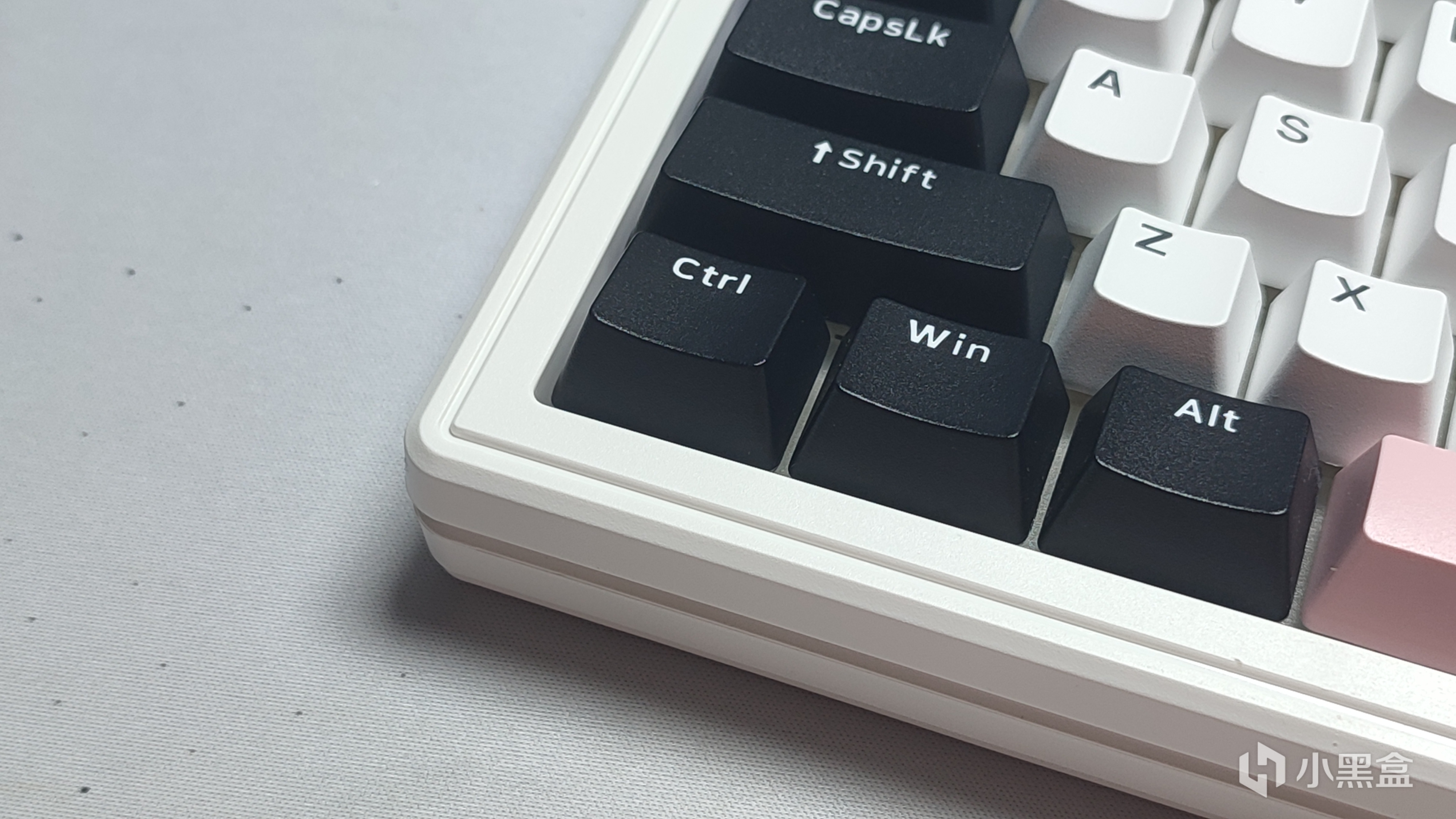 我这把的配色叫甜酷粉,整体采用三拼色的设计,上手的观感以及手感还不错,键帽触感是磨砂质感。整体采用PBT材质双色注塑工艺制成,高度采用的是OEM高度。