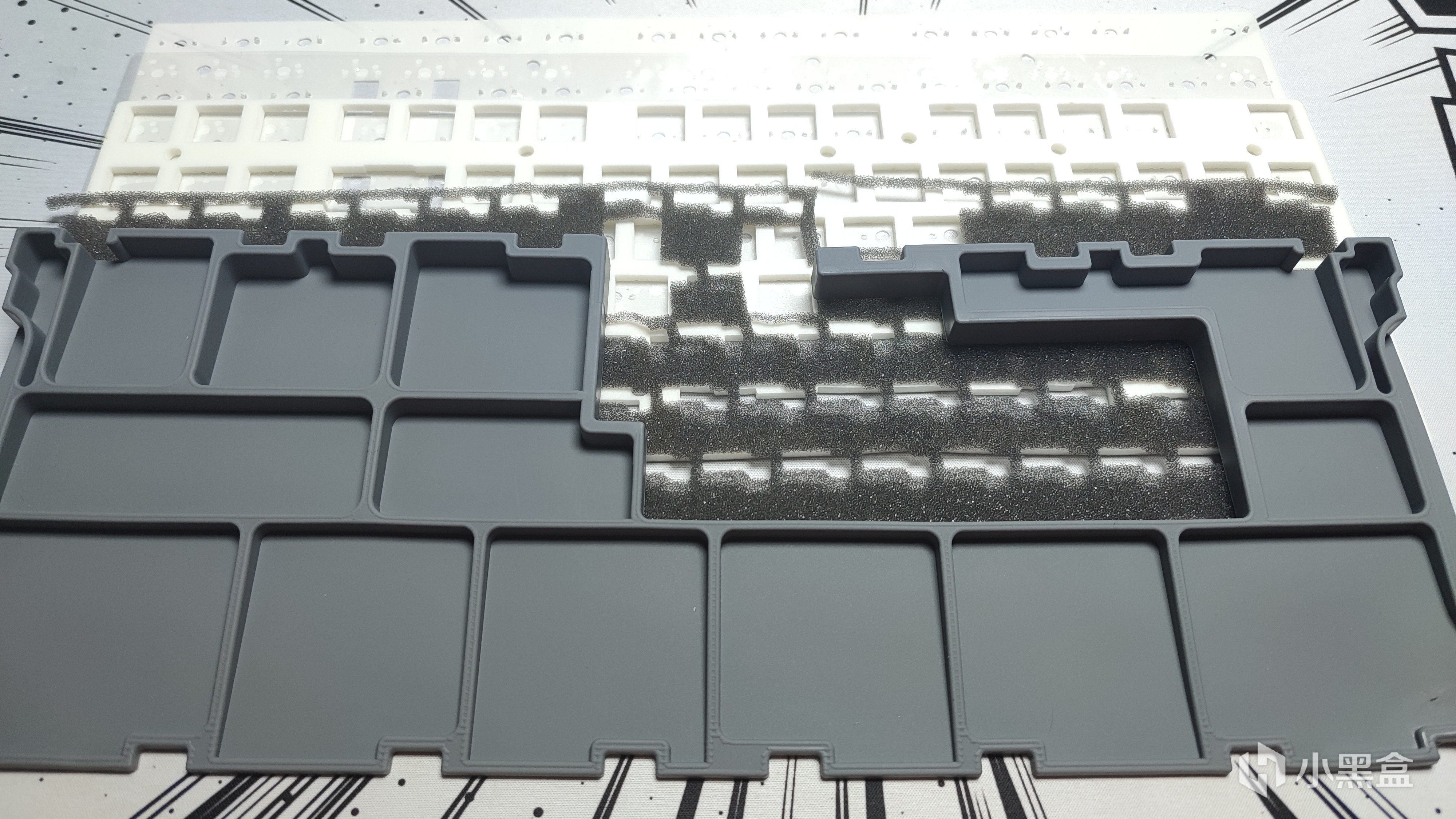 定位板方面,采用的是目前主流GASKET键盘所使用的PC定位板,开槽方面选择了横向开槽,对比不开槽的定位板来说会软一些。