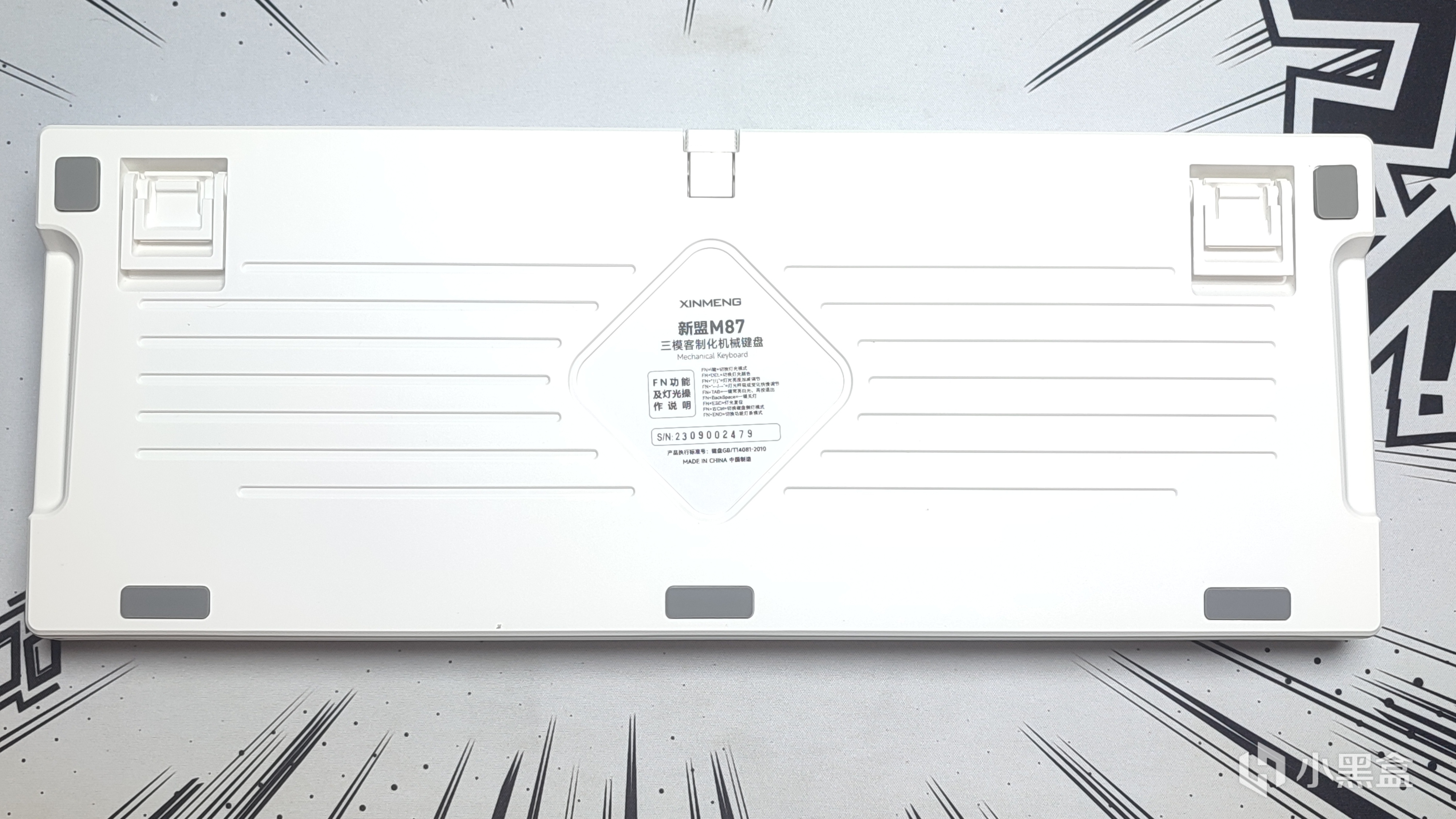 背面的设计我很喜欢,两侧能看到两个凹槽,托起来键盘的时候很舒服,中间则是常见的贴纸,上边记录着一些组合键,要用的时候不用去翻说明书了。我这把字体有点歪,不清楚是不是个例。旁边有几道横条,整体的观感还是很不错的。当然,防滑脚贴以及二段脚撑都没少。