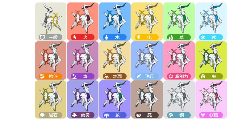 - 阿尔宙斯则是通过不同的石板改变自身配色和属性,也算一种变形。