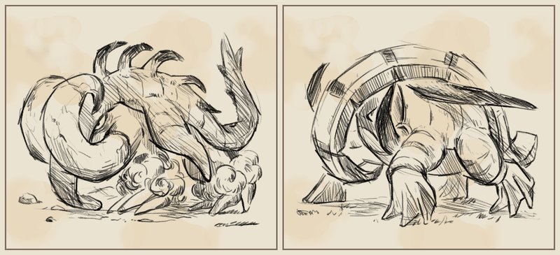 - 铁头壳和铁斑叶原型是第六世代的三剑客,造型设计方面明显来自未来,不仅命名中带有“铁”字,外表充满钢铁、电流和机械感,给人一种机械哥斯拉的味道。