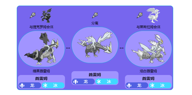 - 第五世代的黑白2游戏中,酋雷姆可以利用进化之楔道具来融合黑白双龙,从而诞生焰白酋雷姆和暗黑酋雷姆。这种以融合为方式产生新宝可梦的方式本质上也是一种变形。